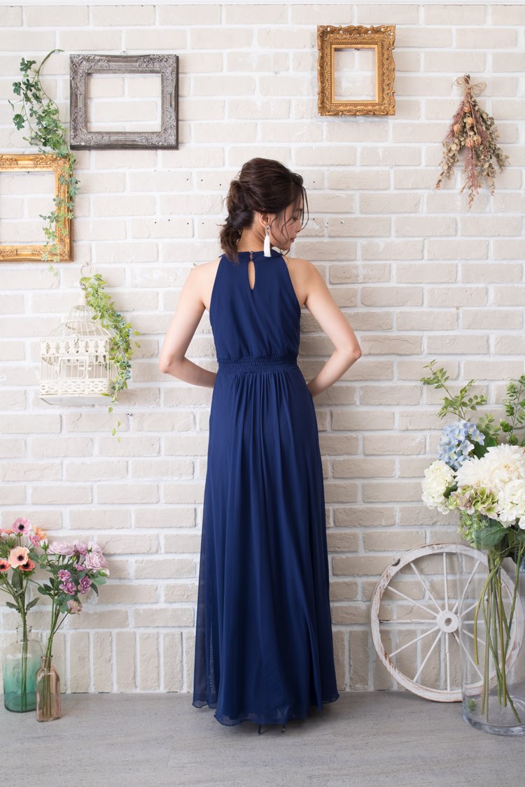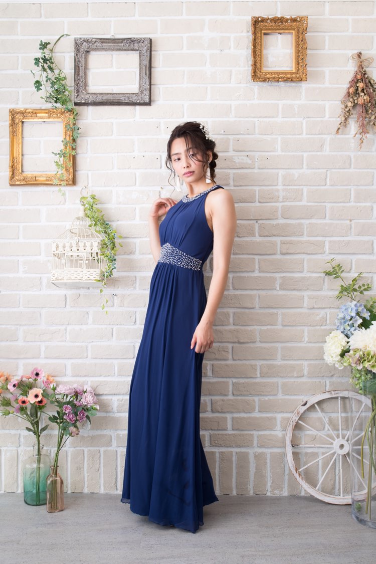 優雅で美しいシルエットで魅了する落ち着いたネイビーカラーのロングドレス。アメリカンスリーブと首元にあしらわれたビジューが上品で華やかな女性らしい色気を漂わせます。360度エレガントに、特別感を演出。胸下プリーツ切り替えなので縦長効果と着痩せ効果抜群です。ストレッチのある素材で身体のラインを綺麗に演出しつつ、しなやかな着こなしをお楽しみいただけます。ショールと合わせた、さらに艶やかなコーディネートがお勧め。ナイトウエディングやパーティー、発表会などのシーンを華やかに彩ってくれる一着です。