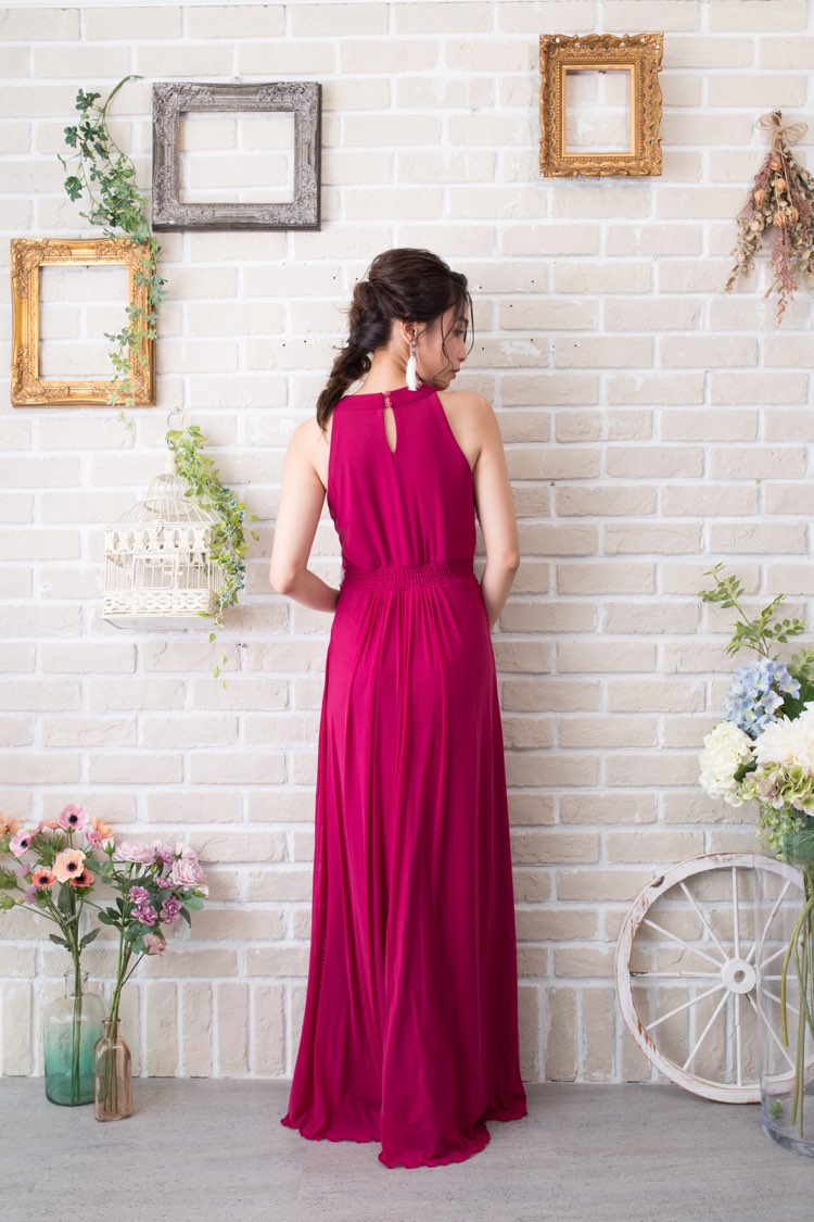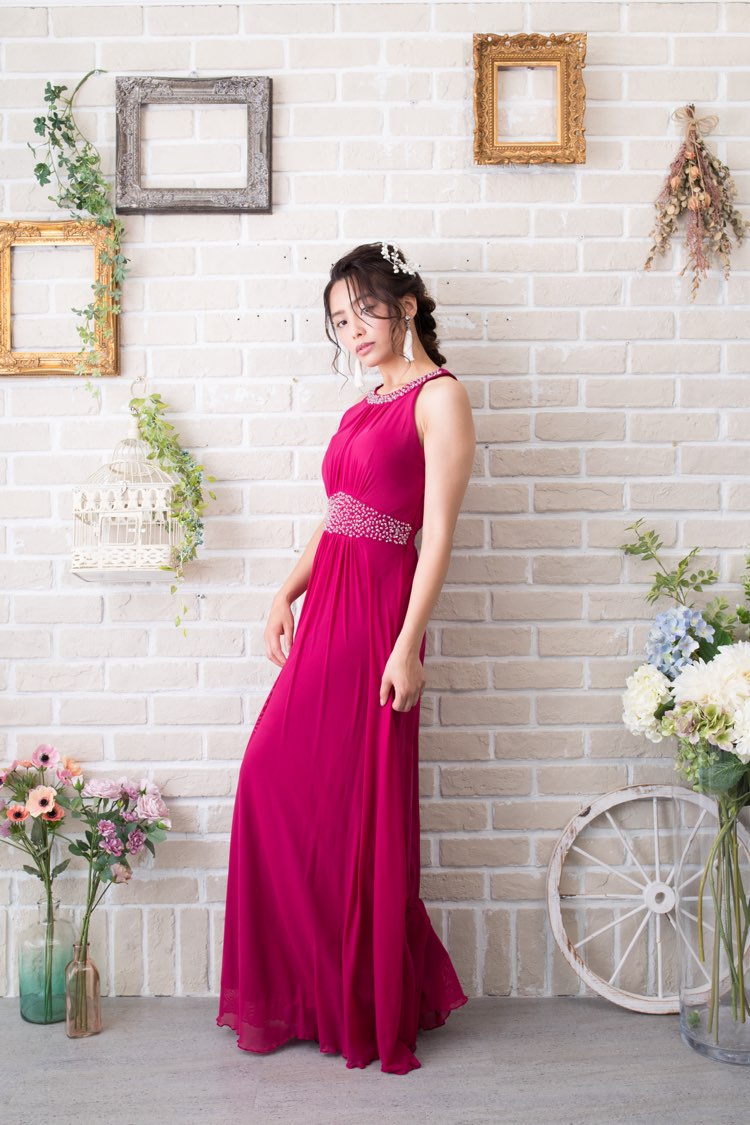 優雅で美しいシルエットで魅了する落ち着いたボルドーカラーのロングドレス。アメリカンスリーブと首元にあしらわれたビジューが上品で華やかな女性らしい色気を漂わせます。360度エレガントに、特別感を演出。胸下プリーツ切り替えなので縦長効果と着痩せ効果抜群です。ストレッチのある素材で身体のラインを綺麗に演出しつつ、しなやかな着こなしをお楽しみいただけます。ショールと合わせた、さらに艶やかなコーディネートがお勧め。ナイトウエディングやパーティー、発表会などのシーンを華やかに彩ってくれる一着です。