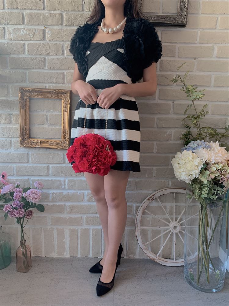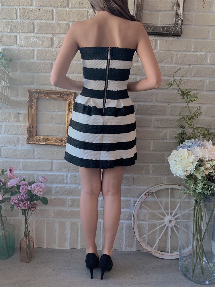 黒、白ボーダーベアドレス。ウエストのラインは、クロスのデザインになっているので、すっきりしてメリハリある印象に。小物に色をさすのがオススメです。短めのドレスなためご身長が低めの方ですとバランスよく着て頂けます。結婚式や結婚式の2次会・謝恩会やパーティーにもお勧めで、黒ストッキングと合わせても可愛いです。羽織ものは黒ボレロで合わせて、バックやお靴に赤などの差し色をいれるとドレスもお小物も映えるオシャレなコーディネートに仕上がります。