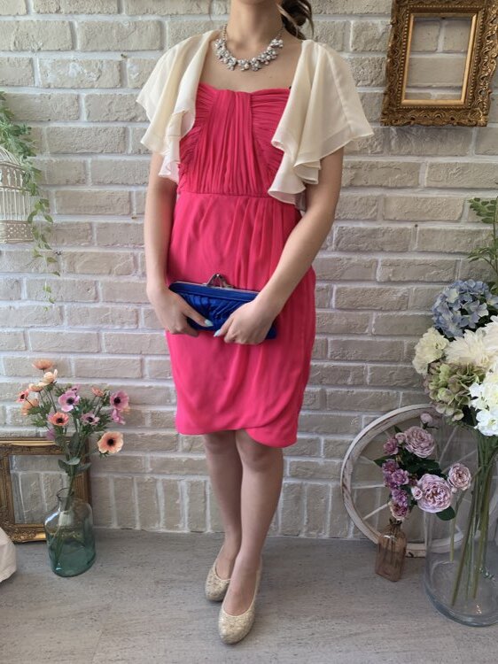 ショッキングピンクのベアドレス。胸元は細身のドレープでリボンのようなデザインとなっています。スカート部分は巻きスカートのようになっていて丈は短めでコクーンシルエットになっています。生地はシフォン素材でオールシーズン着ていただけます。羽織ものはボレロやストール、ファー素材の物等デザインや素材を選ばずコーディネートしていただけます。