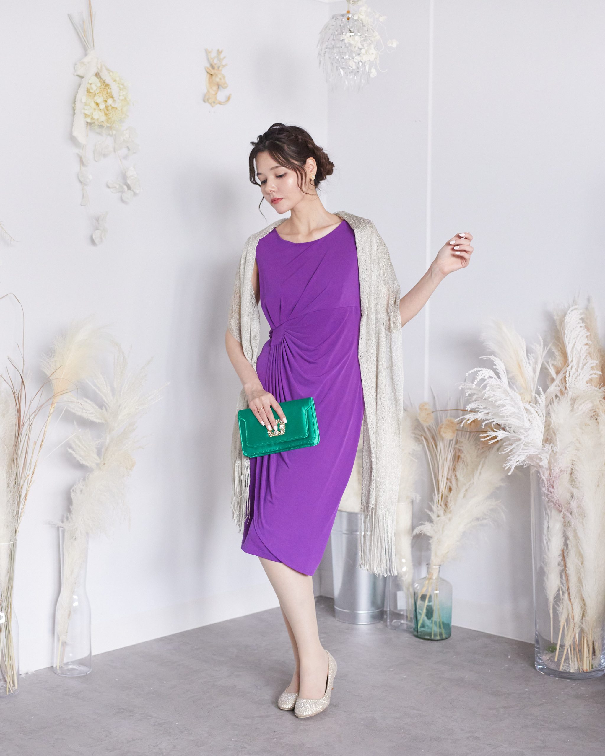明るいライトパープルの丈長めなドレス。伸縮性のある生地なためシワにもならず長時間着て頂いても着心地よくパーティーを楽しんで頂けます。シンプルな縦ラインのドレスですが右にギャザーがよっていることでデザイン性のあるドレスになっております。お肌映りのいいお色なので、結婚式や会社のパーティーなどお写真をたくさんの撮られる機会には是非お勧めします。羽織には縦ラインをより綺麗に見せてくれるストールと合わせて頂いて、バックには、オレンジやイエローなどの明るいの色をもってくるとよりオシャレなコーディネートになります。