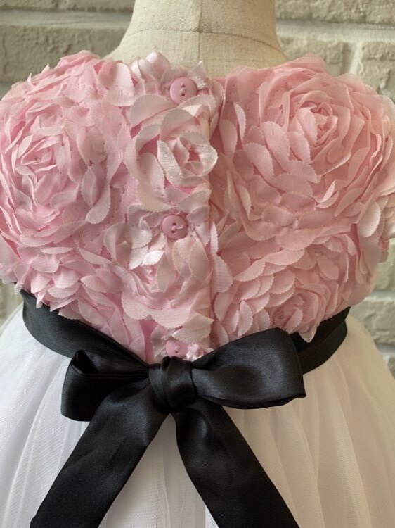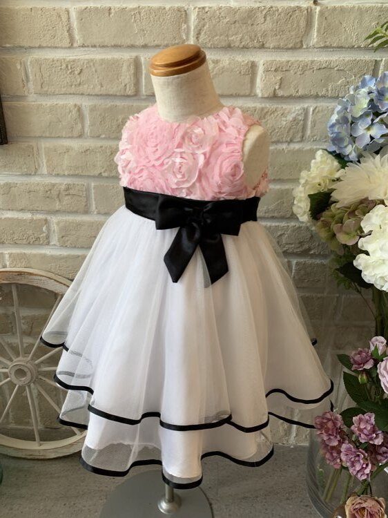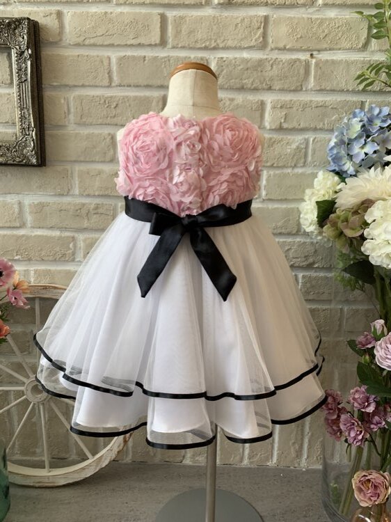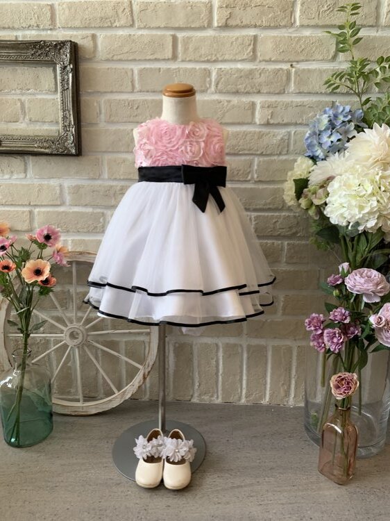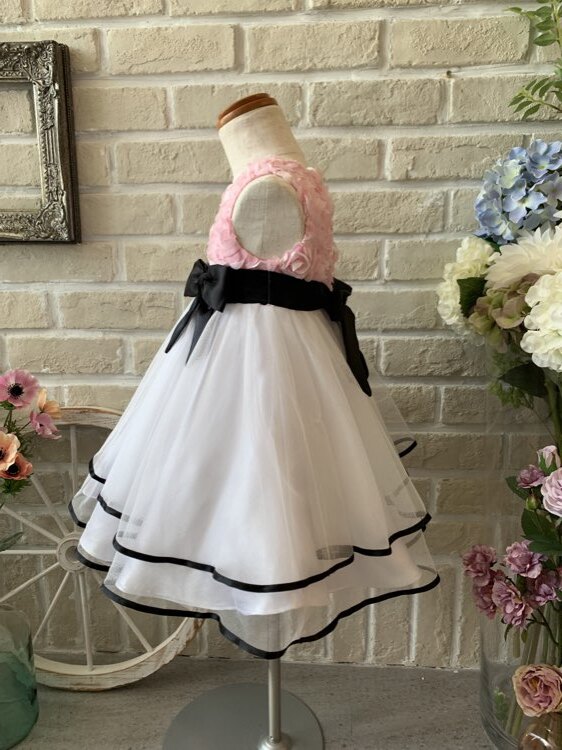 バービーのようなピンク×ブラックのかわいいキッズドレス。胸元とスカート裾ラインのはかわいいピンクカラーにホワイトのふんわりとしたチュールスカートがガーリーな1枚。フェミニンさの中にもウエストのブラックののサテンリボンでぐっと締まり、女の子女の子し過ぎないデザインも魅力的です。胸元の薔薇のお花やチュールスカートが華やかなデザインですので発表会やお食事会などのシーンにおすすめです。