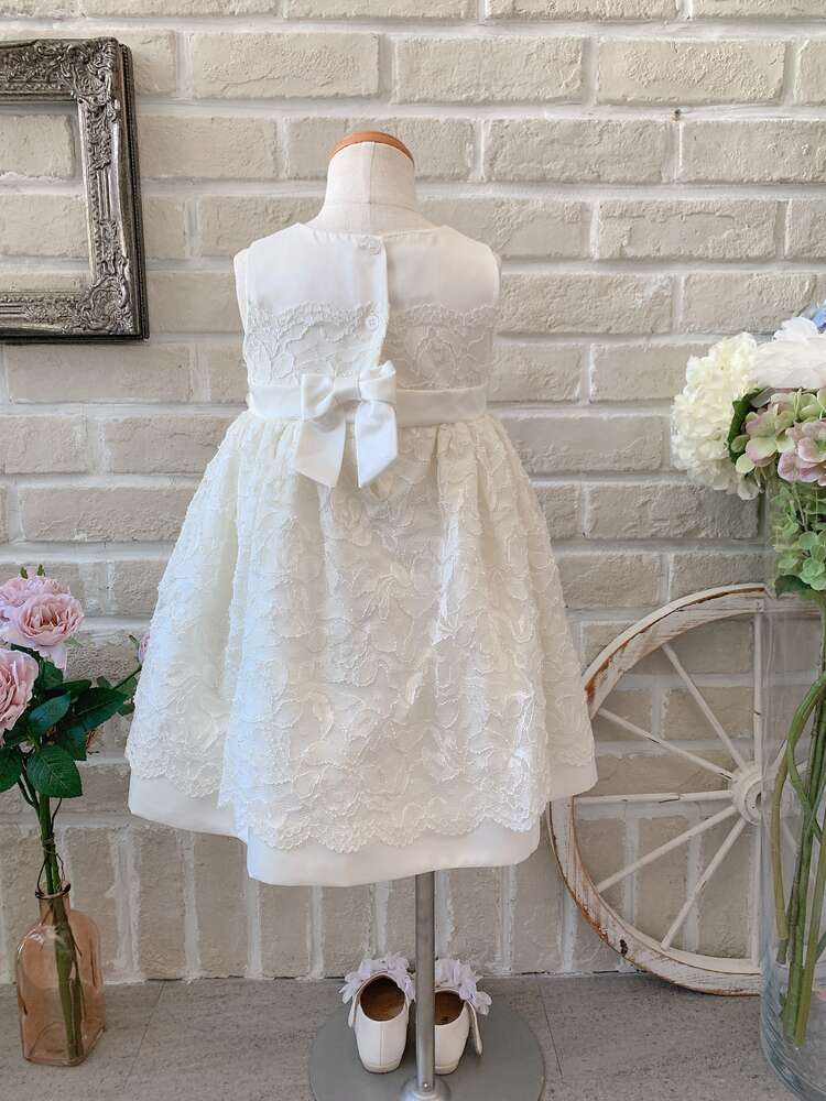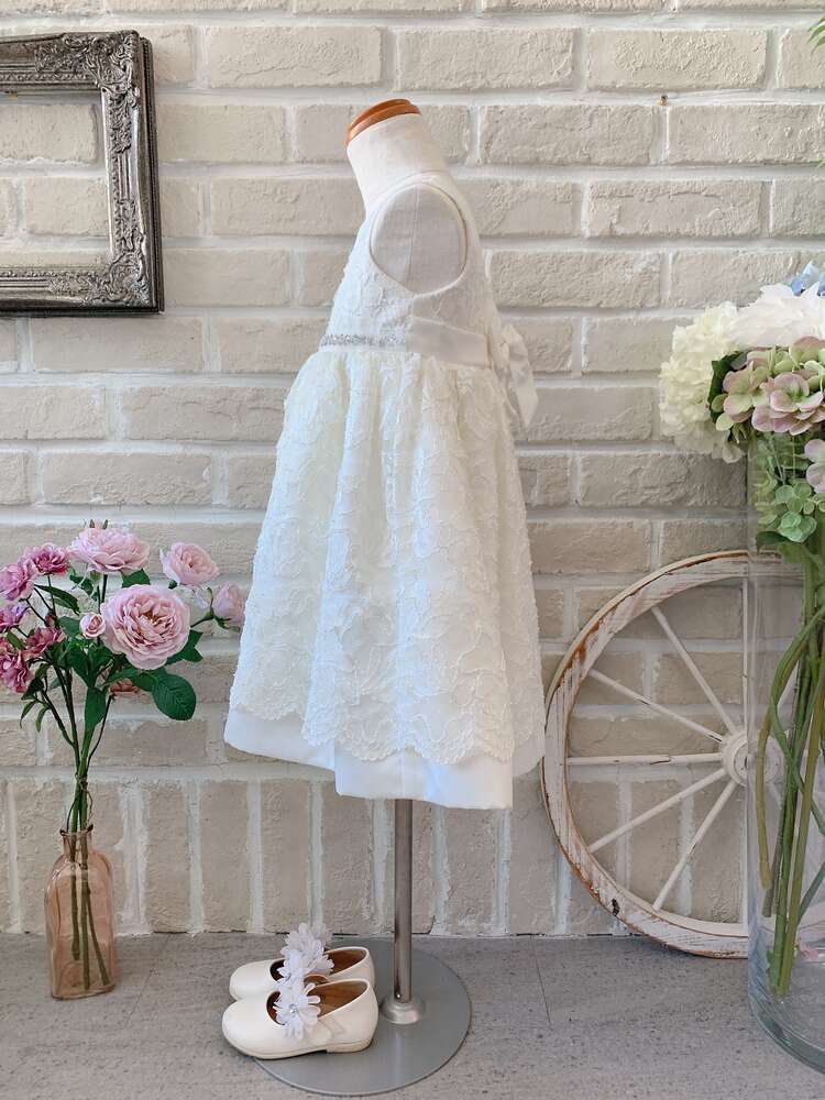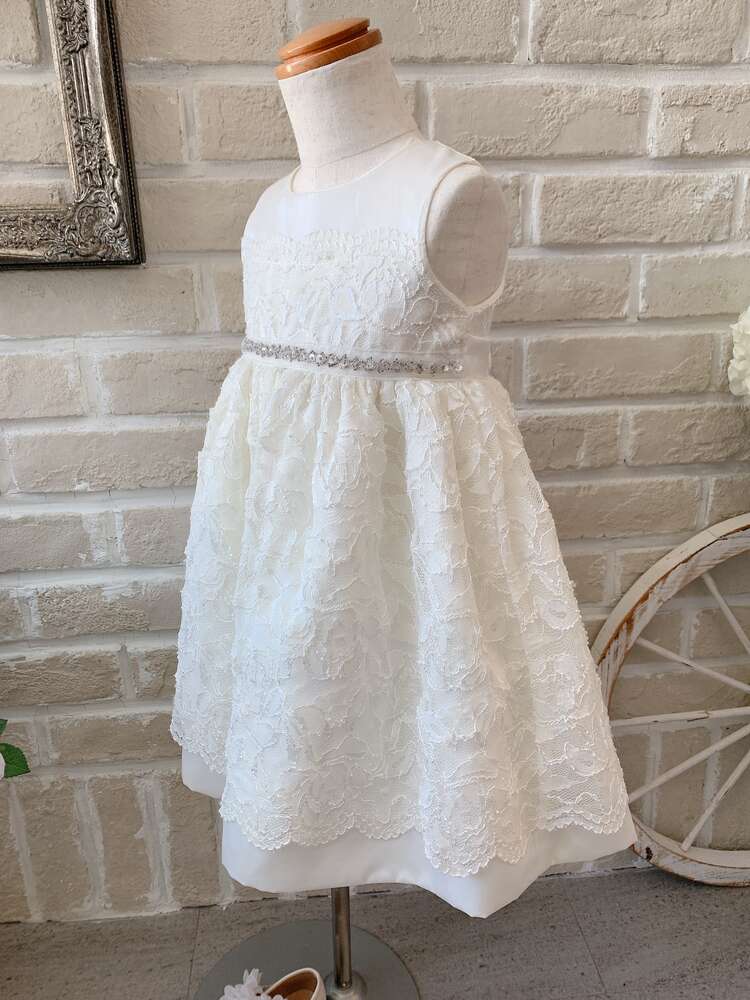 純白の上品なレースにふんわり膨らんだスカートのデザインは、女の子のあこがれを詰め込んだ、まさに”お姫様のドレス”です。ウエストにはキラキラのビジューがあしらわれており、清楚でいて華やかな印象です。しっかりした生地ですので、白でもインナーも透け感もなく、さらにスカートはパニエ内蔵で、シルエットもとてもきれいです。小さい花嫁様のような雰囲気で結婚式のおよばれはもちろん、リングガールやフラワーガールにもオススメです。他にもピアノの発表会、七五三の写真撮影、バースデーフォト等様々なシーンで活躍すること間違いなしの一着です。