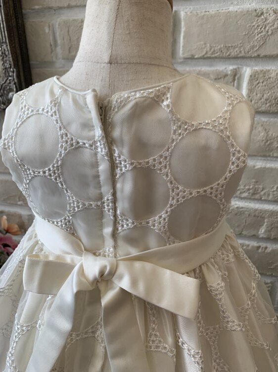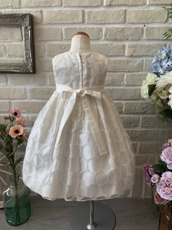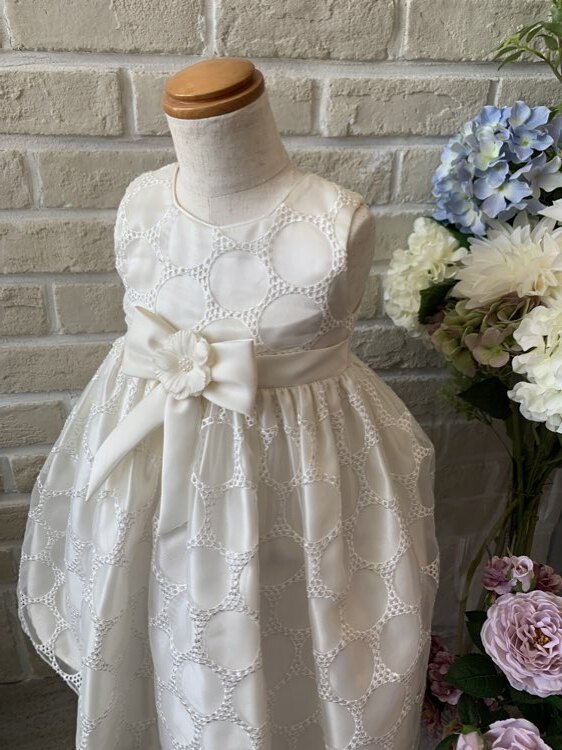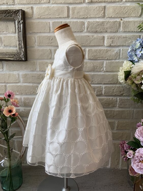 純白ドット柄の刺繍のキッズドレス。ウエストのリボンも可愛く、レトロでポップ、そしてクラシカルな雰囲気漂う60年代ファッション風の1着。白でもインナーも透け感もなく、さらにふんわり膨らんだスカートはパニエ内蔵で、シルエットもとてもきれいです。結婚式のおよばれはもちろん、リングガールやフラワーガールにもオススメです。他にもピアノの発表会、七五三の写真撮影、バースデーフォト等様々なシーンで活躍すること間違いなしの一着です。
