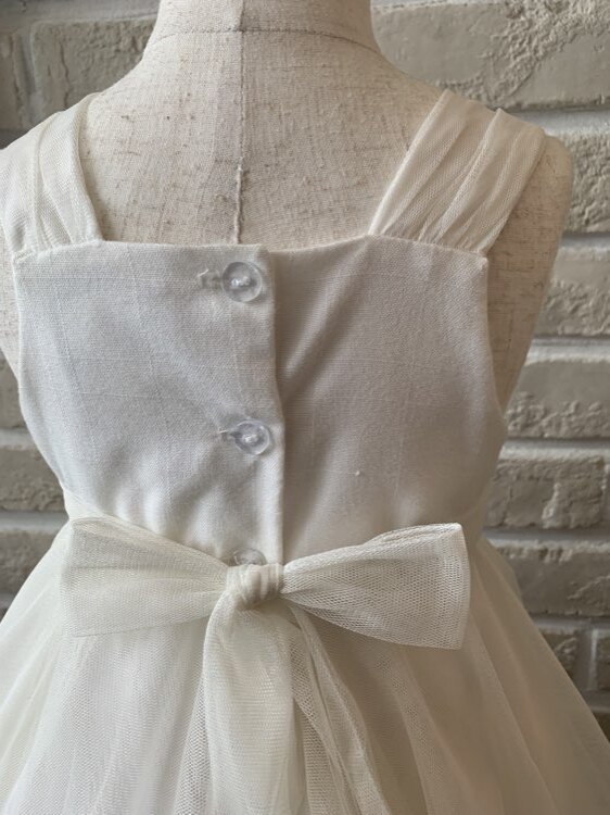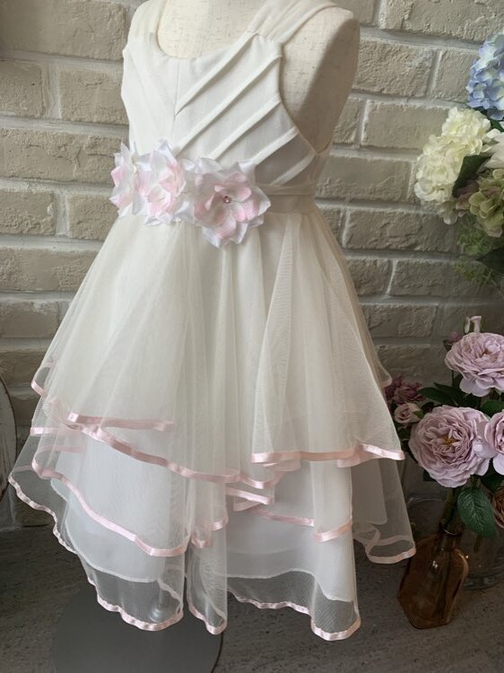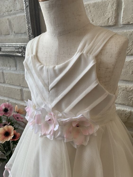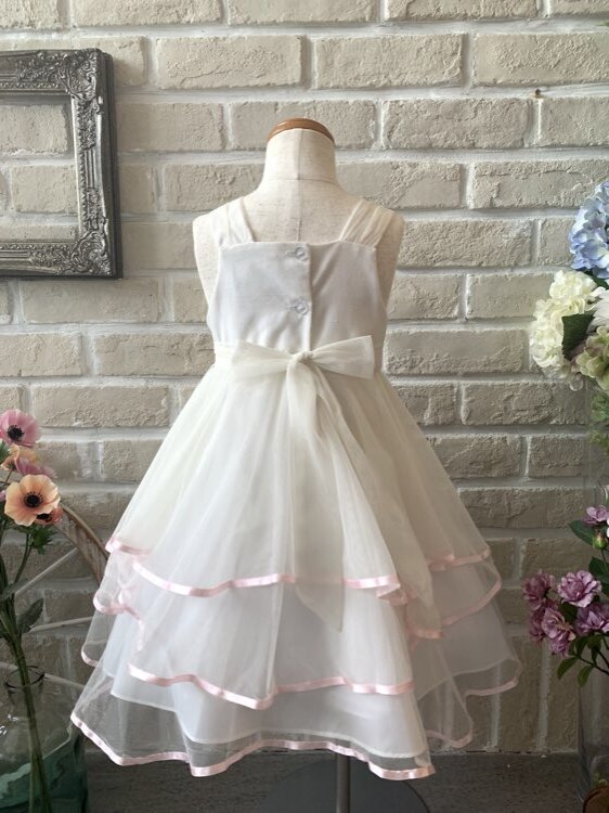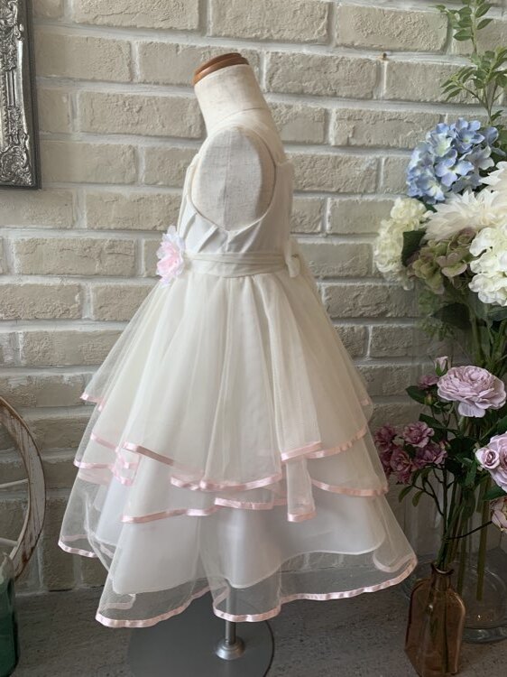 淡いピンクのお花がロマンティックなキッズドレスです。裾にもピンクのパイピングがあしらわれており、ティアードのスカートは、お子様の動きに合わせてふわふわ揺れる様子は、お花の妖精さながら、ロマンティックそのもの。後ろでリボンを結ぶようになっていて、後ろ姿も可愛らしくなるだけでなく、ウエストのサイズ調整もできます。ピアノやヴァイオリンの発表会・演奏会・コンクール、結婚式のおよばれ、フラワーガール・リングガールの衣装、七五三やお誕生日の写真撮影、パーティーどのシーンにもぴったりの1着です。