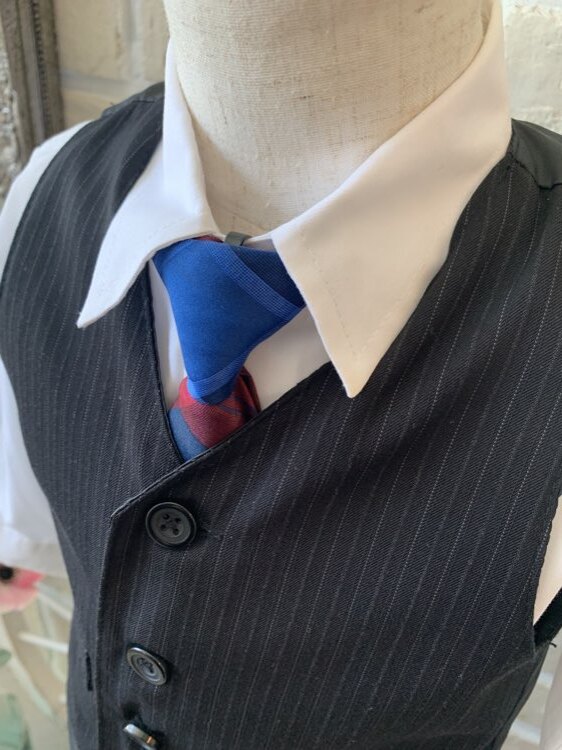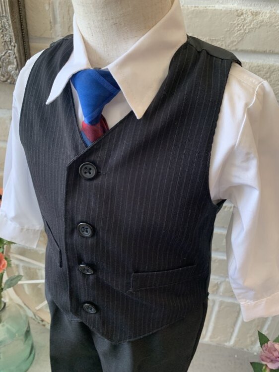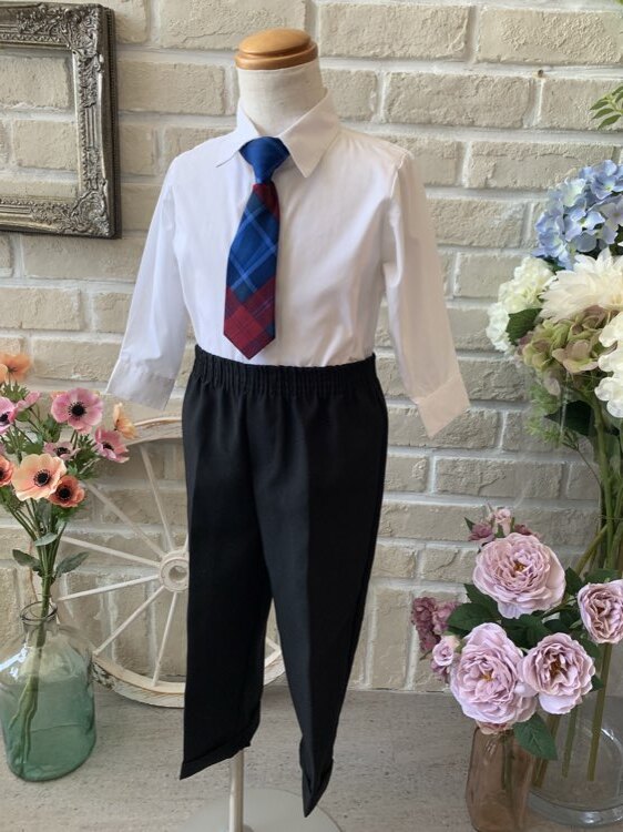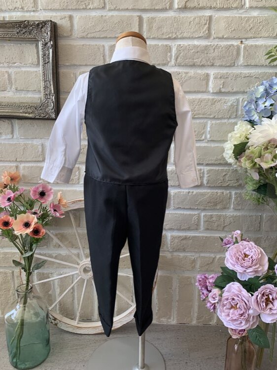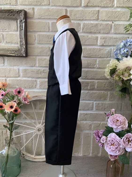 結婚式・発表会に大活躍間違いなしのキッズタキシード。定番のシンプルなモノトーンセットアップにブルー×レッドのチェック柄ネクタイがポイントになったデザイン。ベストにグレーの細かいラインが入りオシャレな印象に!ネクタイはクリップ式ですので装着もラクチン、パンツのウエスト部分はゴム仕様となっており締め付け感もなく安心です。いつもは元気いっぱいのお子様も、シックな男の子に大変身です。2歳前後のお子様に。。