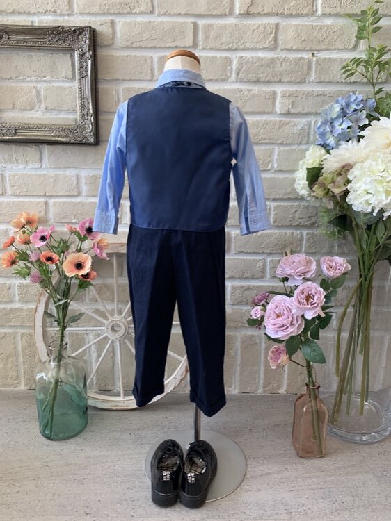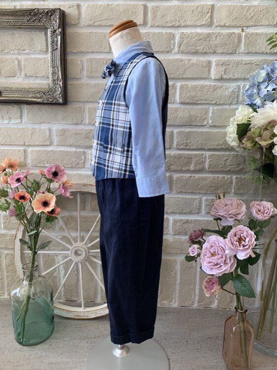 結婚式・発表会に大活躍間違いなしのキッズタキシード。優しいブルーカラーのシャツにチェック柄のベスト・蝶ネクタイがスタイリッシュな印象。ブルーを基調としたデザインで爽やかさもあり、パンツの素材も100%コットンですので夏の暑い時期でも快適に着用頂けます。蝶ネクタイはマジックテープ仕様となっており装着も簡単!!可愛いお子様も、このタキシードでオシャレな紳士の装いに☆2歳前後のお子様に。。