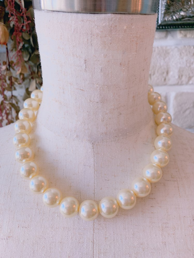 同じ大きさのパールを組み合わせたネックレスです。パールはホワイトすぎないため肌に馴染み、柔らかく落ち着いた雰囲気に良く合います。パーティーやお祝いの席にぴったりのほどよいボリューム感と華やかさが使いやすさ◎。 胸元のあきが気になるドレスにプラスすれば、デコルテを華やかに演出してくれます。5cmのアジャスター付き。