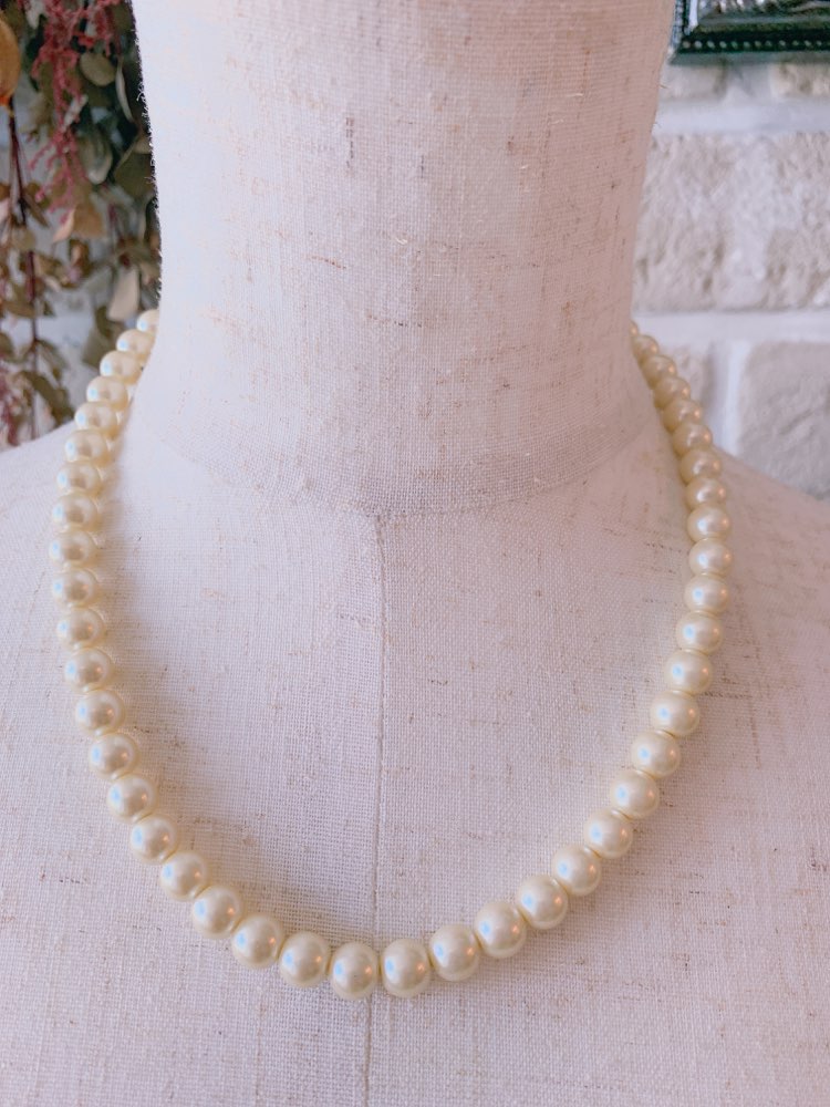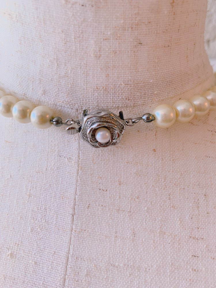 同じ大きさのパールを組み合わせたネックレスです。パールはホワイトすぎないため肌に馴染み、柔らかく落ち着いた雰囲気に良く合います。後ろのホックも薔薇をモチーフにしていて、パーティーやお祝いの席にぴったりのほどよいボリューム感と華やかさが使いやすさ◎。 胸元のあきが気になるドレスにプラスすれば、デコルテを華やかに演出してくれます。調節可能なアジャスター付き。