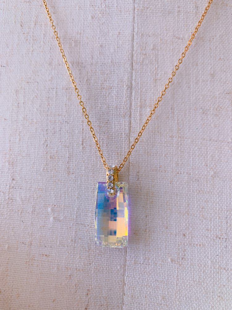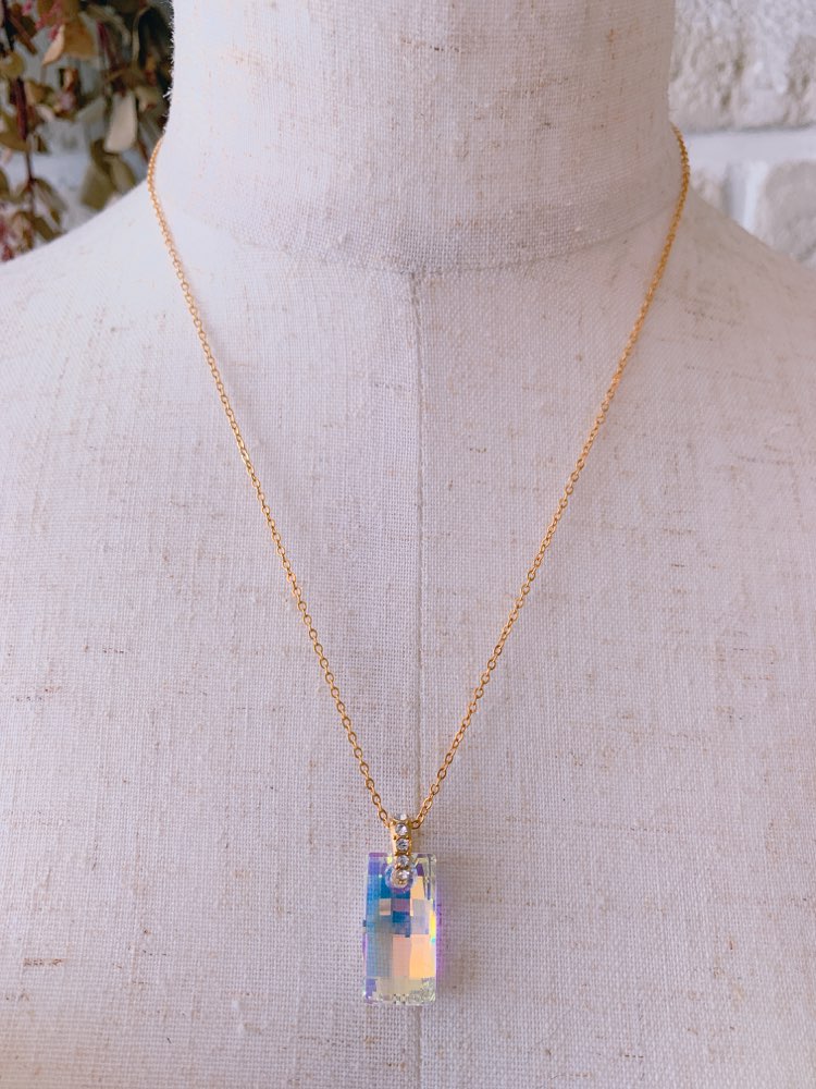 オーロラ色のクリスタルを組み合わせたシンプルなネックレスです。ゴールドは、肌に馴染んで落ち着いた雰囲気にも良く合います。パーティーやお祝いの席にぴったりのほどよいシンプル感と華やかさが使いやすさ◎。 胸元のあきが気になるドレスにプラスすれば、デコルテを華やかに演出してくれます。調節可能なアジャスター付き。