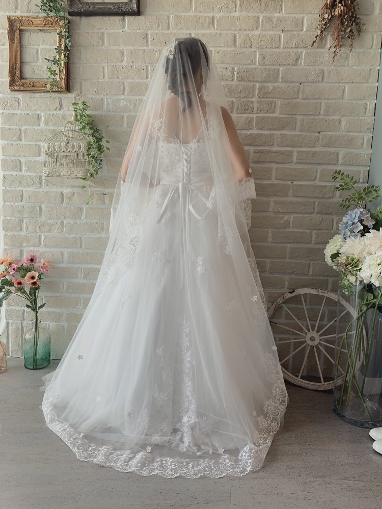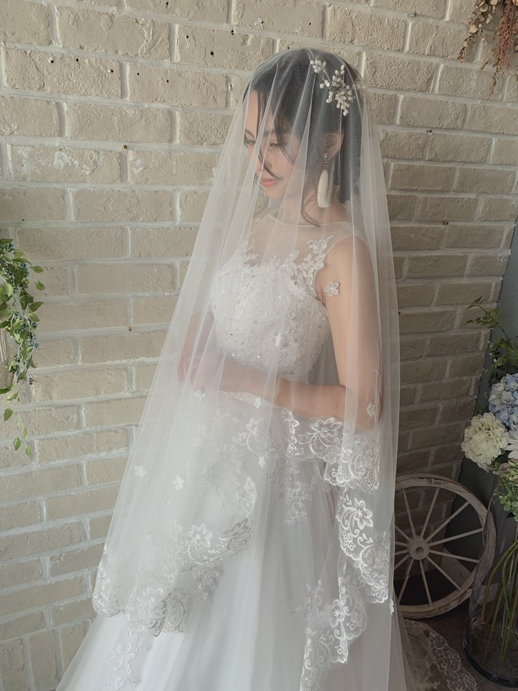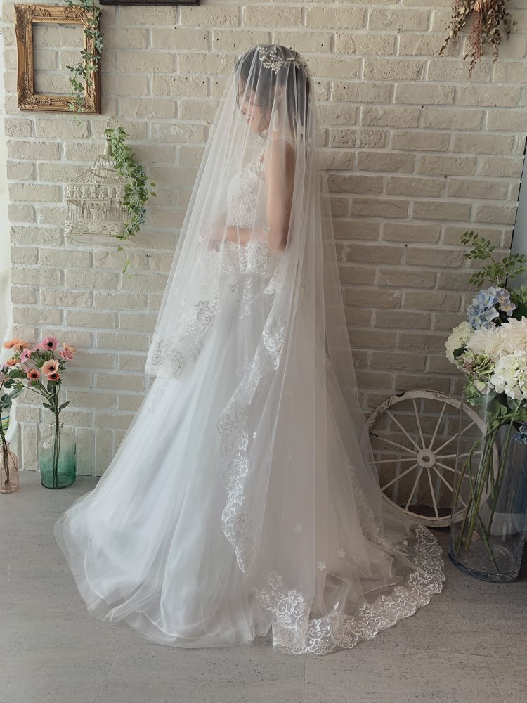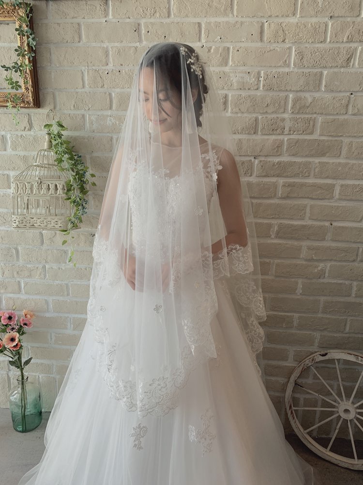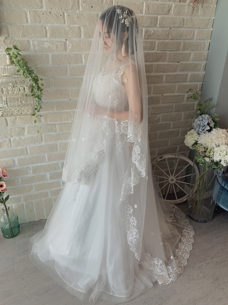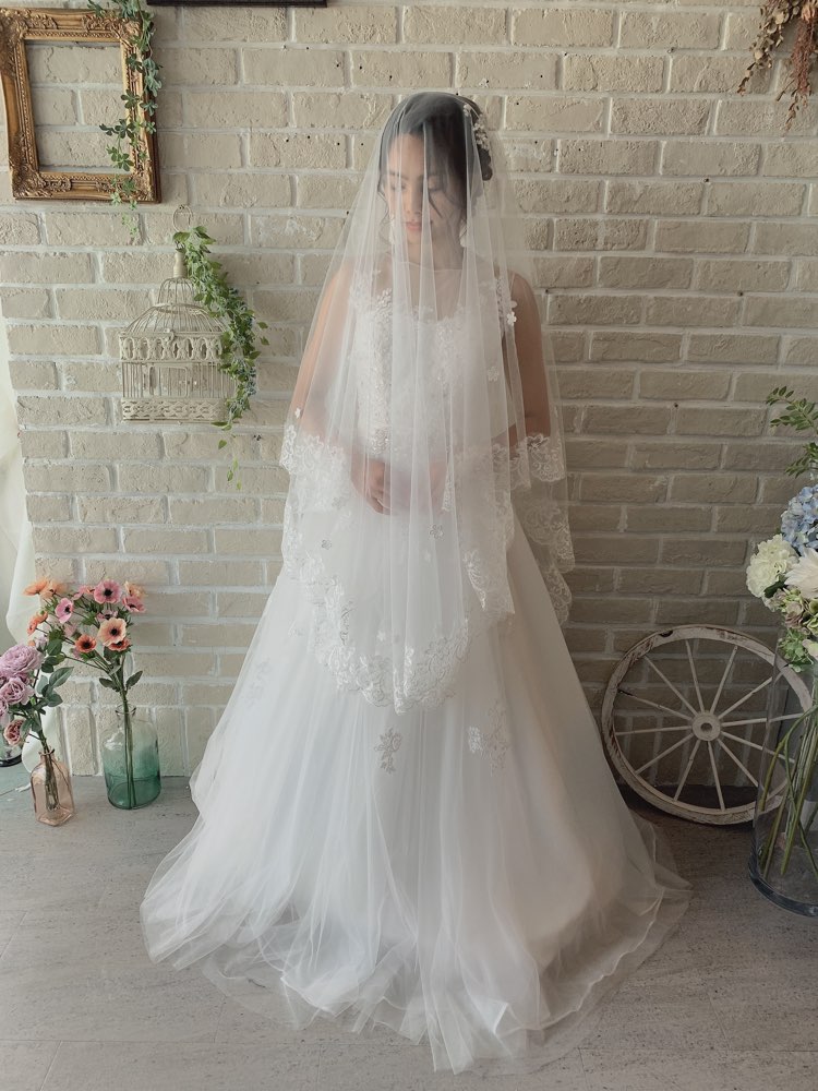 美しいレース刺繍縁、可愛らしい印象を与える花嫁ですベールです。二の腕が隠れるくらいの程よい丈感は、初々しく愛らしい花嫁という印象を与え、全体的にスッキリとスタイルよく見せることができます。結婚式や海外挙式フォトウエディングなどのブライダルシーンにおすすめのマリアベールです。