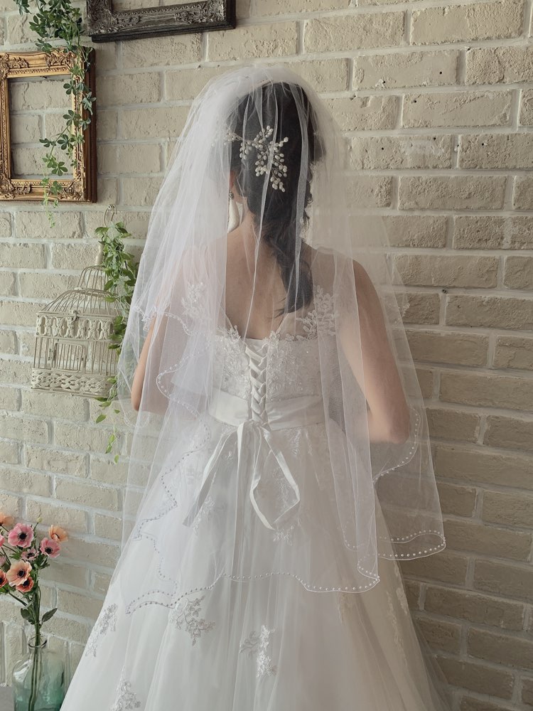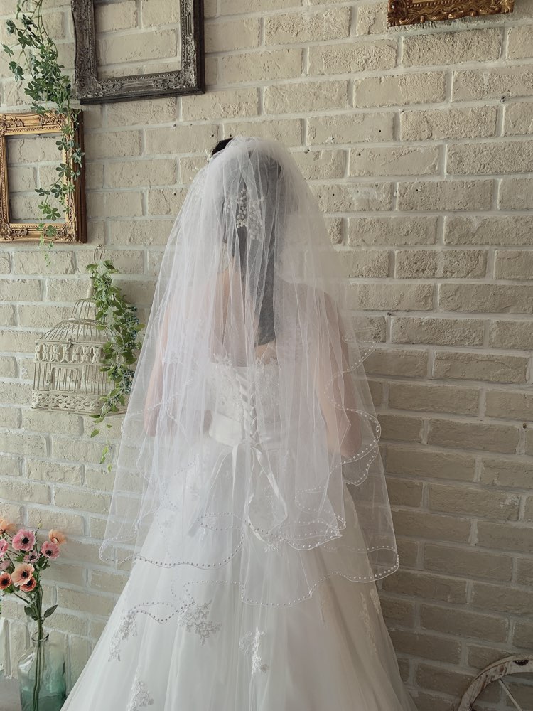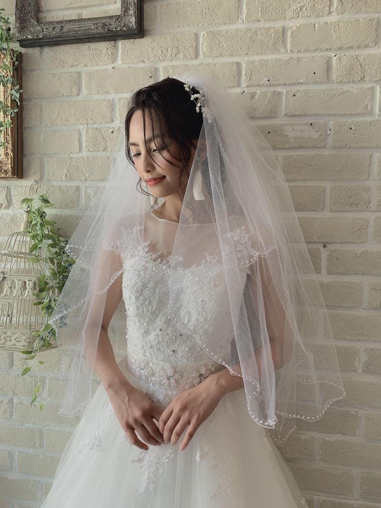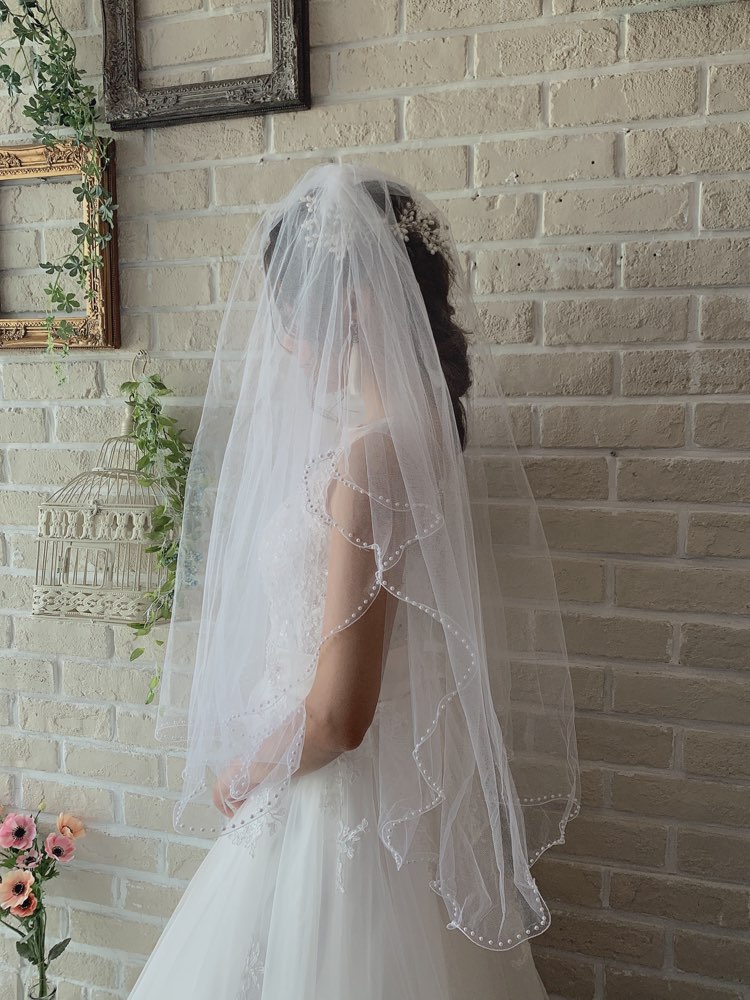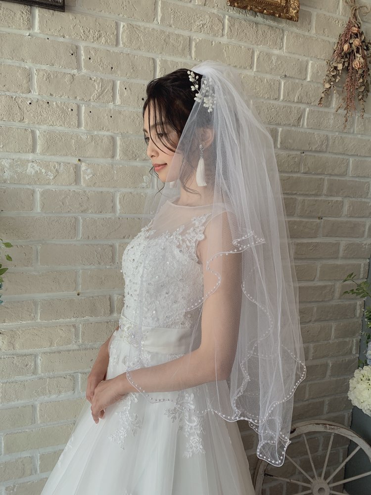 シンプルなデザインで人気があるベールです。柔らかくしっとりとした生地に小粒のパールがあしらわれ、気品溢れる清楚な印象に。色々なデザインのドレスに合わせやすいのも嬉しいポイント。 挙式にはもちろん、前撮りにもオススメの1点です。