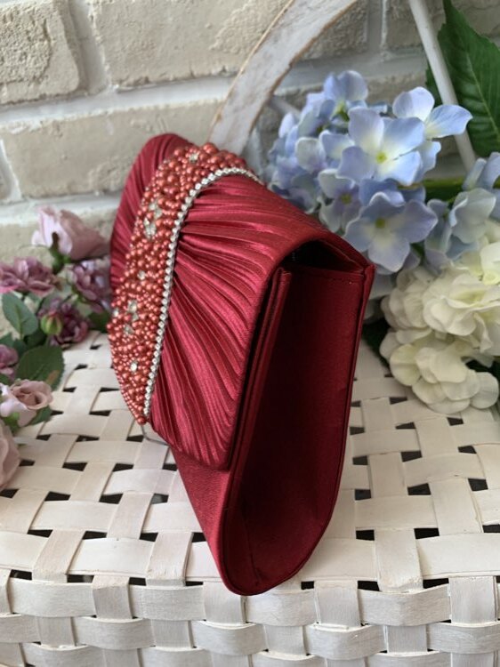 華やかでボリュームあるパールビジュがエレガントなボルドーカラーのバッグです。前面に敷き詰めれれたパールベルトが煌びやかな雰囲気を放ち上品な演出を叶えてくれます。シンプルなドレスもゴージャスバッグをONすれば、華やかさとお洒落感をブラッシュアップ。チェーン付きの2way仕様なので、利用シーンによって持ち方を替えられるのも嬉しいポイントです。袱紗が入る大きさで、収納力もあり抜群の機能性。結婚式や二次会、各種パーティなど華やかな場面にぴったりなバッグです。