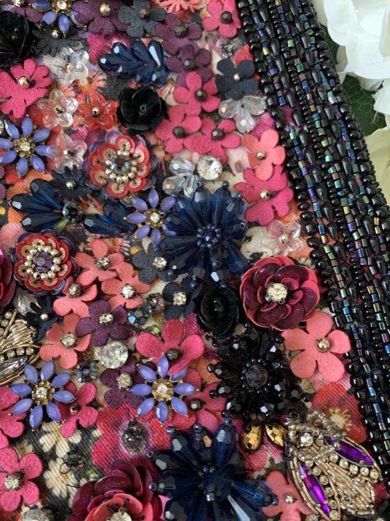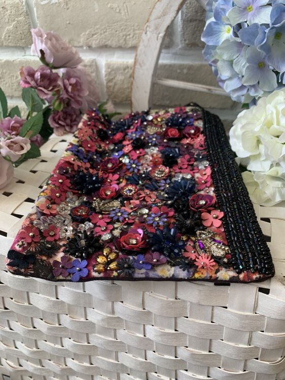 華やかなビーズとビジューのクラッチバッグです。細かいディテールまで凝ったデザインで、一面お花のデザインのビジューは、とてもエレガントな印象を与えてくれます。落ち着いたネイビーカラーとビジューの輝きは、大人な雰囲気を放ち上品な演出を叶えてくれます。シンプルなドレスもこのバッグをONすれば、華やかさとお洒落感をブラッシュアップ。袱紗が入る大きさで、ポケットの多く、収納力抜群の機能性。2つ折りで柔らかい素材感。結婚式や二次会、各種パーティなど華やかな場面にぴったりなバッグです。