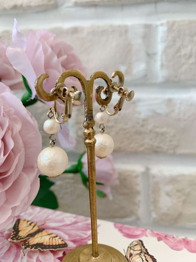 大きさの異なる二種類のコットンパールを組み合わせたとてもキュートなイヤリングです。程よいボリューム感と上品さをかねそなえているので、結婚式や食事会、パーティーなど様々なシーンでお使い頂けます。アップスタイルはもちろん、ダウンスタイルなどコンパクトなシルエットのヘアスタイルと相性バツグンです。とても煌びやかながらなので、シンプルなドレスと組み合わせれば、より一層お顔周りも華やかに引き立ちます。