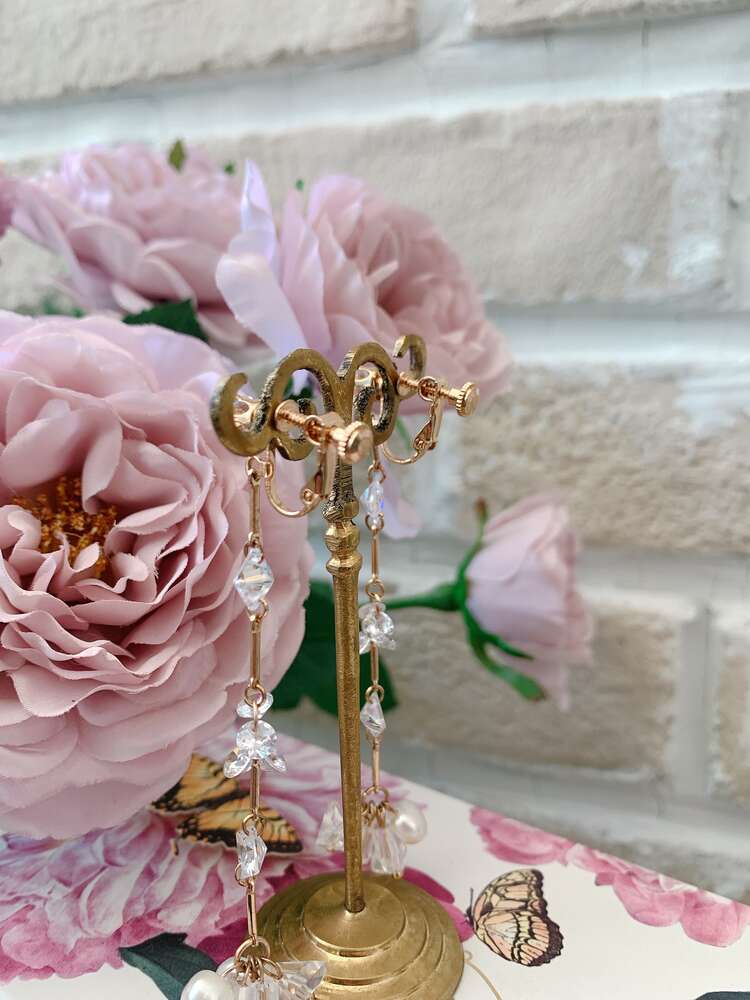 大きさや形の異なるクリスタルが煌めく、シンプルかつとてもキュートなイヤリングです。遠くからでも程よく目立つボリューム感と上品さをかねそなえているので、結婚式や食事会、パーティーなど様々なシーンでお使い頂けます。お耳元がよく見えるアップスタイルはもちろん、ダウンスタイルなどコンパクトなシルエットのヘアスタイルと相性バツグンです。とても煌びやかながらなので、シンプルなドレスと組み合わせれば、より一層お顔周りも華やかに引き立ちます。