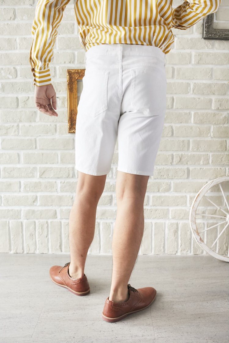 ホワイトデニムのハーフパンツ。トップスには、柄やカラーのシャツや、ベストなど合わせるとより一層おしゃれなカジュアルタキシードコーディネートになります。二次会や1.5次会、ビーチウェディング、レストランウェディング、ガーデンウェディング、様々なシーンでご利用頂けます。また、カジュアルスタイルの前撮り写真撮影にもおすすめ致します。柔らかな素材感なので長時間着ていても負担は少ないと思います。