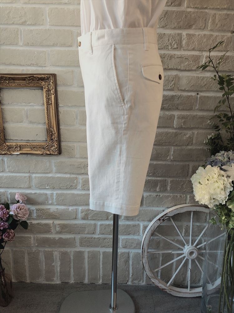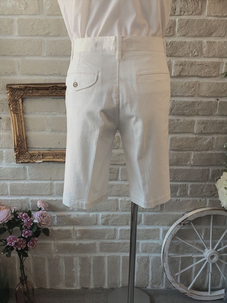 ホワイトのハーフパンツ。トップスには、柄やカラーのシャツや、ベストなど合わせるとより一層おしゃれなカジュアルタキシードコーディネートになります。二次会や1.5次会、ビーチウェディング、レストランウェディング、ガーデンウェディング、様々なシーンでご利用頂けます。また、カジュアルスタイルの前撮り写真撮影にもおすすめ致します。柔らかな素材感なので長時間着ていても負担は少ないと思います。