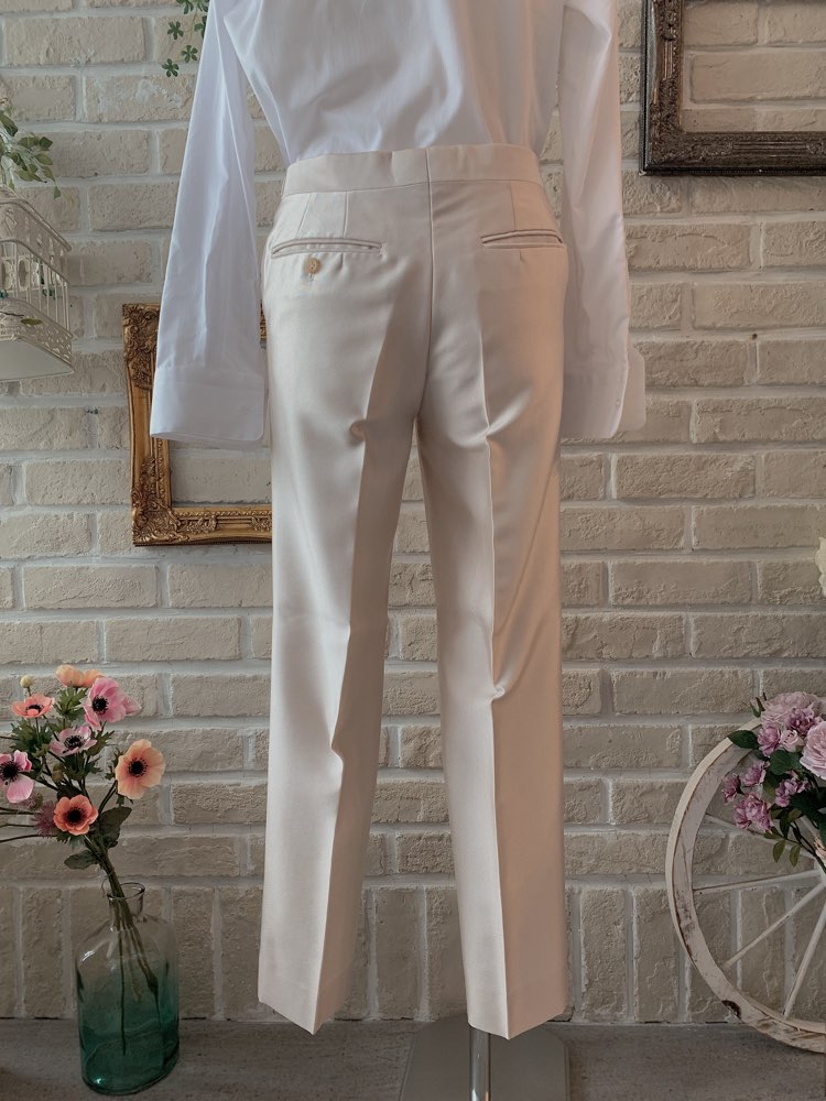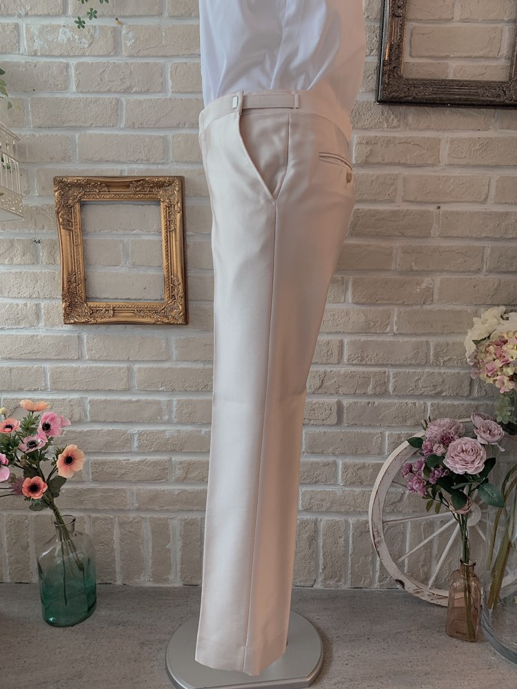 ピンクベージュのパンツはマットな仕上がりで、とても上品な素材です。セットのジャケットと合わせれば暗めな色味でも華やかな印象になります。挙式などにもお使い頂けるデザインとなっておりますので、前撮り写真撮影にもおすすめです。生地感はそれ程厚くないので、長時間着ていても負担は少ないと思います。披露宴のお色直し、二次会、1.5次会、リゾートウェディング、レストランウェディング、パーティー、様々なシーンでご利用頂けます。