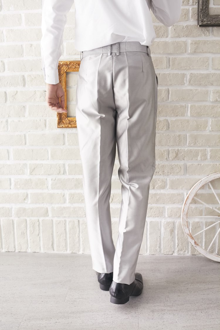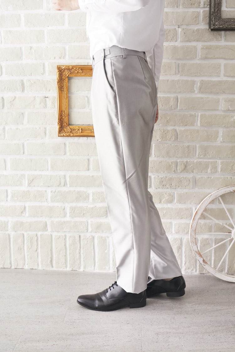 パンツは光沢感のある上品な素材です。セットのジャケットと合わせれば挙式などにもお使い頂けるデザインとなっておりますので、前撮り写真撮影にもおすすめです。生地感はそれ程暑くないで、長時間着ていても負担は少ないと思います。パンツウェストにはアジャスター付きなので、お客様の丁度いいサイズに合わせる事が可能。