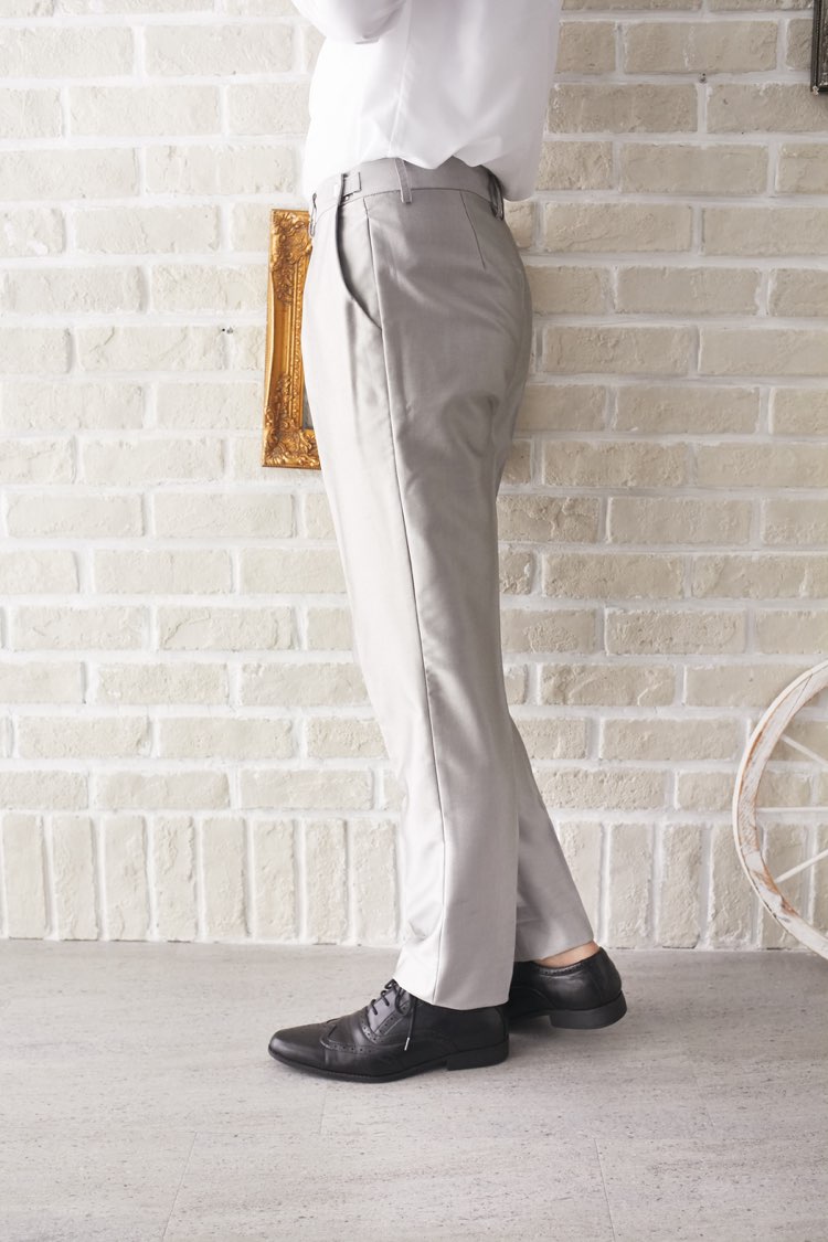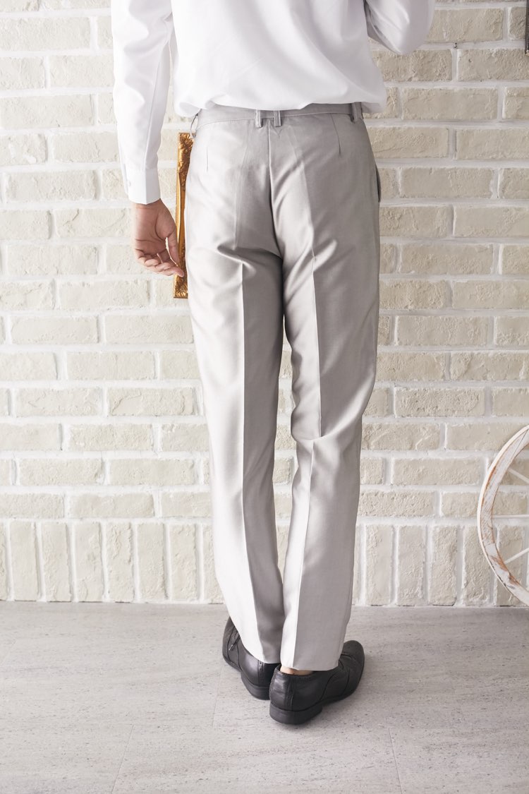 パンツは光沢感のある上品な素材です。セットのジャケットと合わせれば挙式などにもお使い頂けるデザインとなっておりますので、前撮り写真撮影にもおすすめです。生地感はそれ程暑くないで、長時間着ていても負担は少ないと思います。パンツウェストにはアジャスター付きなので、お客様の丁度いいサイズに合わせる事が可能。