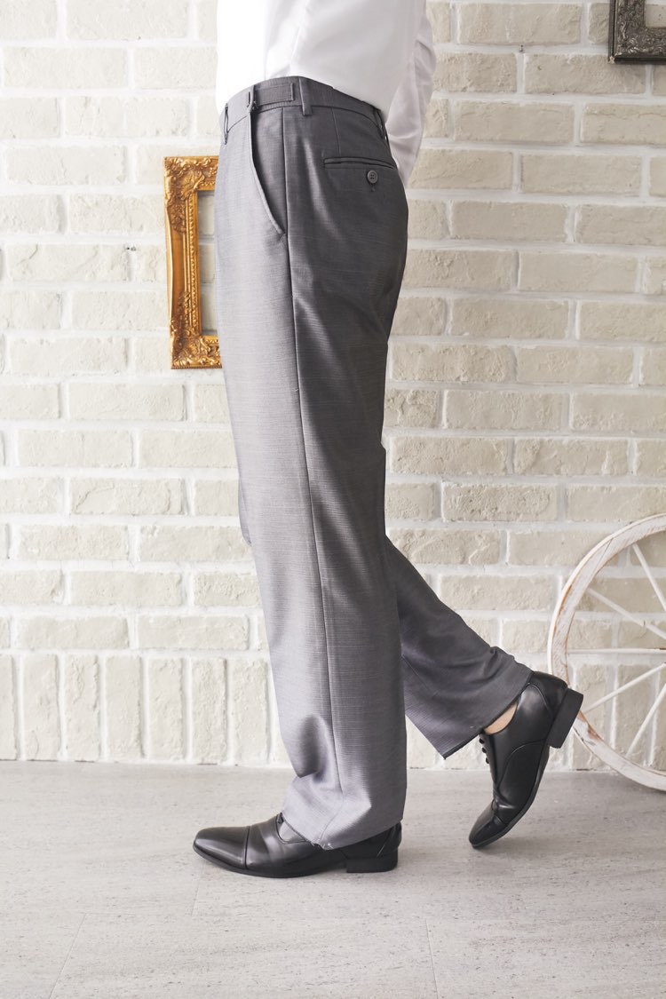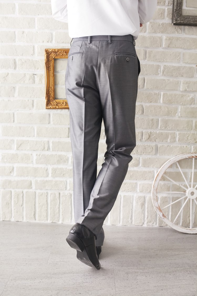 パンツはダークグレーの光沢感のある上品な素材です。セットのジャケットと合わせれば挙式などにもお使い頂けるデザインとなっておりますので、前撮り写真撮影にもおすすめです。生地感はそれ程暑くないで、長時間着ていても負担は少ないと思います。パンツウェストにはアジャスター付きなので、お客様の丁度いいサイズに合わせる事が可能。