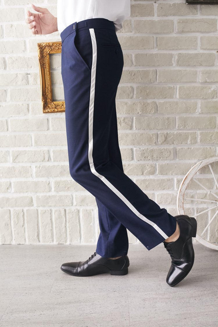 ネイビーのパンツはマットな仕上がりで、とても上品な素材です。セットのジャケットと合わせればとっても華やかな印象になります。挙式などにもお使い頂けるデザインとなっておりますので、前撮り写真撮影にもおすすめです。生地感はそれ程厚くないので、長時間着ていても負担は少ないと思います。披露宴のお色直し、二次会、1.5次会、リゾートウェディング、レストランウェディング、パーティー、様々なシーンでご利用頂けます。サイドに入ったブラックのラインがアクセントになっていてスッキリした印象に見えます。ウェストにはアジャスターがついているので、サイズ調整可能。お客様のサイズに合わせる事が出来ます。