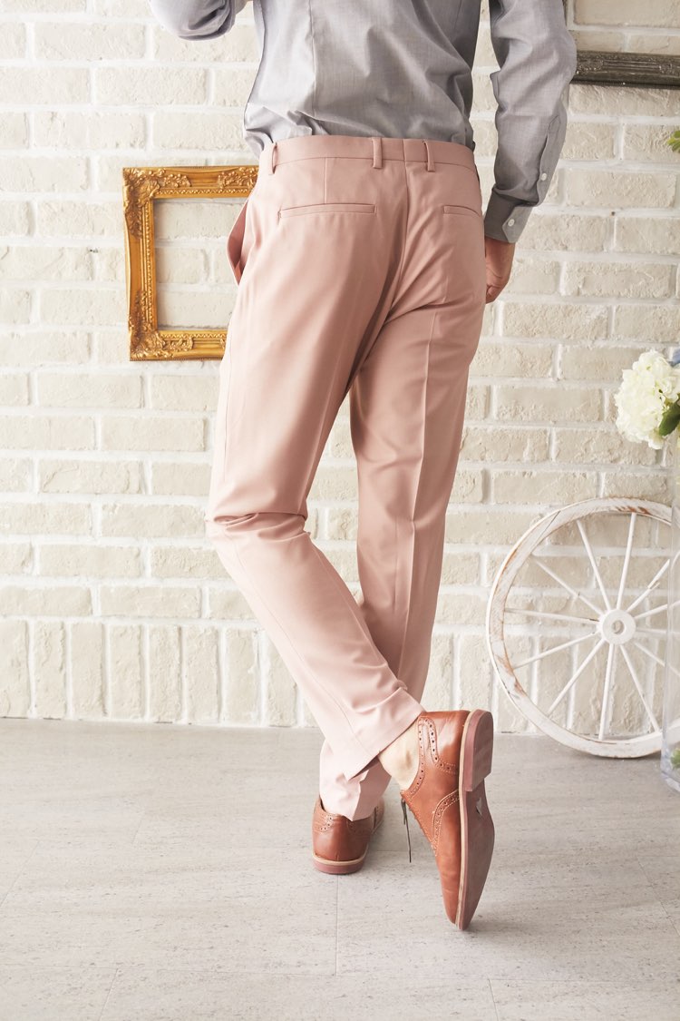 淡いピンクのカジュアルパンツ。トップスには、カラーのシャツや、ベストなど合わせるとより一層おしゃれなカジュアルタキシードコーディネートになります。二次会や1.5次会、ビーチウェディング、レストランウェディング、ガーデンウェディング、様々なシーンでご利用頂けます。また、カジュアルスタイルの前撮り写真撮影にもおすすめ致します。柔らかな素材感なので長時間着ていても負担は少ないと思います。
