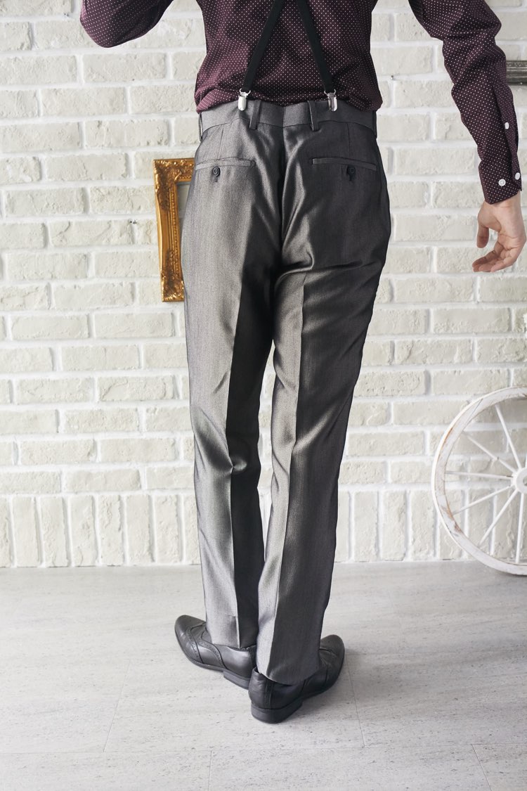 ダークグレーのパンツは光沢感のある上品な素材です。セットのジャケットと合わせれば挙式などにもお使い頂けるデザインとなっておりますので、前撮り写真撮影にもおすすめです。生地感はそれ程厚くないので、長時間着ていても負担は少ないと思います。パンツウェストにはアジャスター付きなので、お客様の丁度いいサイズに合わせる事が可能。披露宴のお色直し、二次会、1.5次会、リゾートウェディング、レストランウェディング、パーティー、様々なシーンでご利用頂けます。ウェスト部分にアジャスター付きなのでサイズ調整可能。お客様のサイズに合わせる事が出来ます。