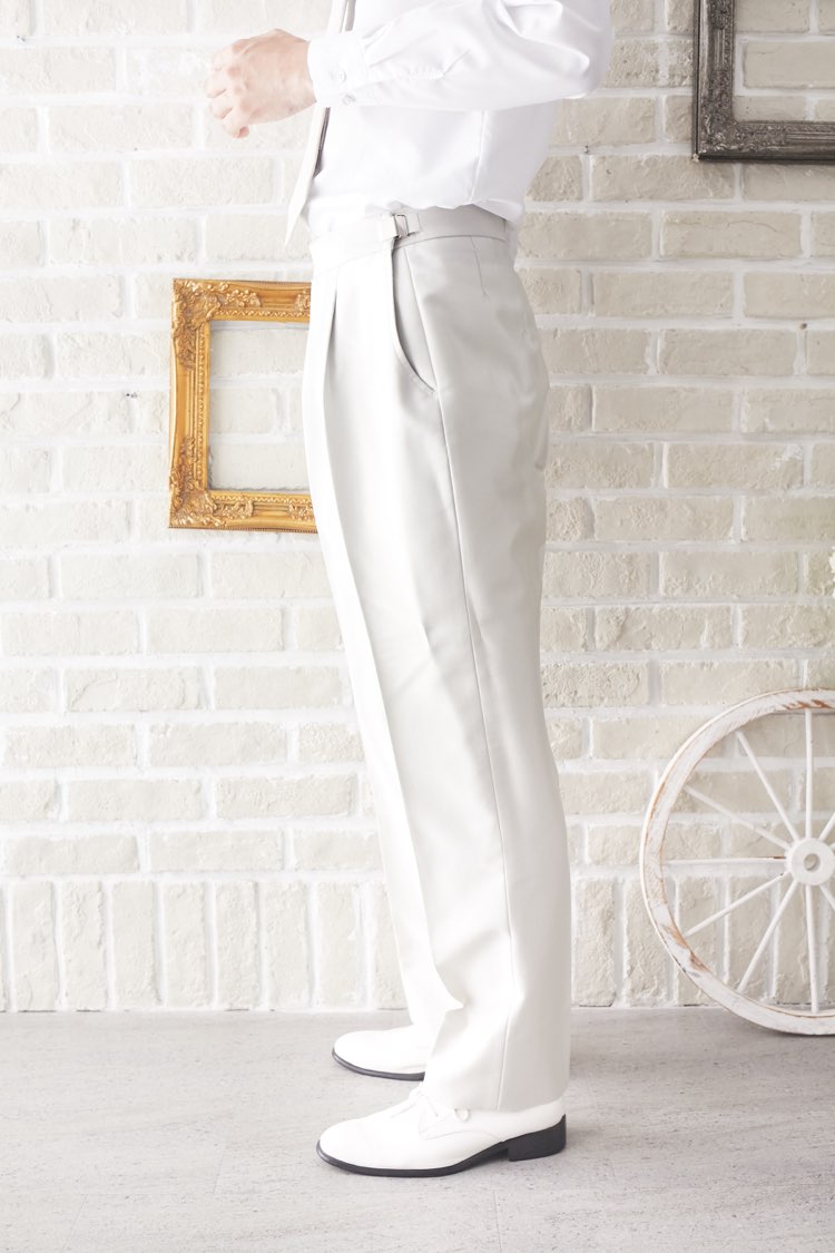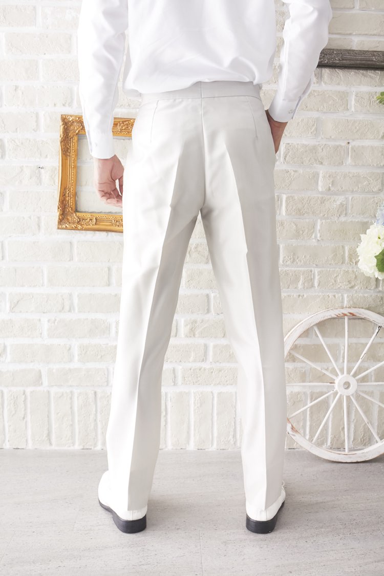 パンツはアイボリーで光沢感のある上品な素材です。で薄っすらとストライプが入っているのでスッキリとした印象になります。セットのジャケットと合わせれば挙式などにもお使い頂けるデザインとなっておりますので、前撮り写真撮影にもおすすめです。生地感はそれ程暑くないで、長時間着ていても負担は少ないと思います。パンツウェストにはアジャスター付きなので、お客様の丁度いいサイズに合わせる事が可能。