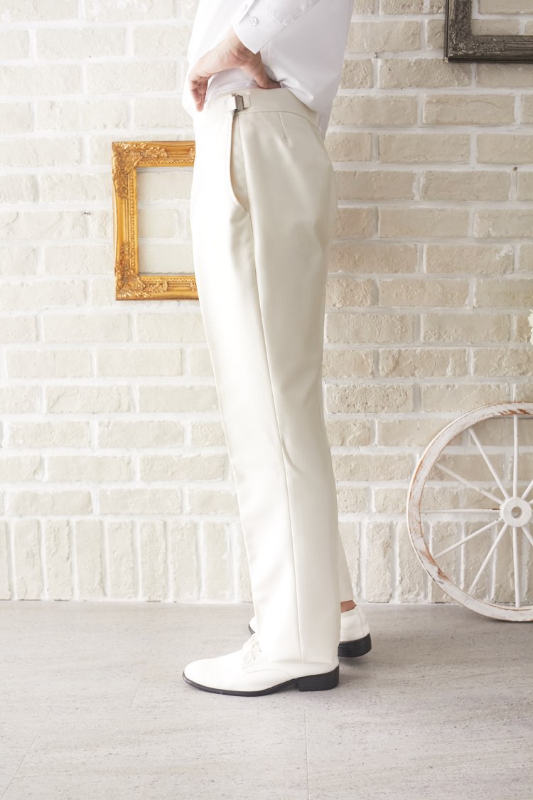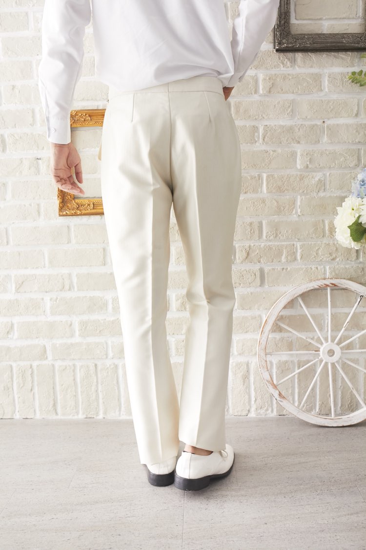 パンツはホワイトで光沢感のある上品な素材です。で薄っすらとストライプが入っているのでスッキリとした印象になります。セットのジャケットと合わせれば挙式などにもお使い頂けるデザインとなっておりますので、前撮り写真撮影にもおすすめです。生地感はそれ程暑くないで、長時間着ていても負担は少ないと思います。パンツウェストにはアジャスター付きなので、お客様の丁度いいサイズに合わせる事が可能。