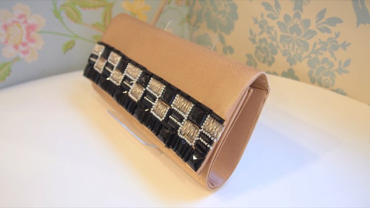 お呼ばれコーデでは定番人気のベージュにブラックビーズのジオメトリックデザインがピリッと効いたクラッチバッグ。かっこよく大人っぽい雰囲気がお好きな方におすすめしたいアイテムです。コーディネートのアクセントとして活躍してくれそうなデザインですが、程よい装飾なので落ち着きも持ち合わせ、パーティーだけでなく結婚式のお呼ばれコーデに取り入れるのにも安心感がありますね。都会的で無駄がないシンプルなドレスにさらっと合わせていただくとこなれ感のある、大人の余裕と遊び心が漂うスタイルに仕上がります。