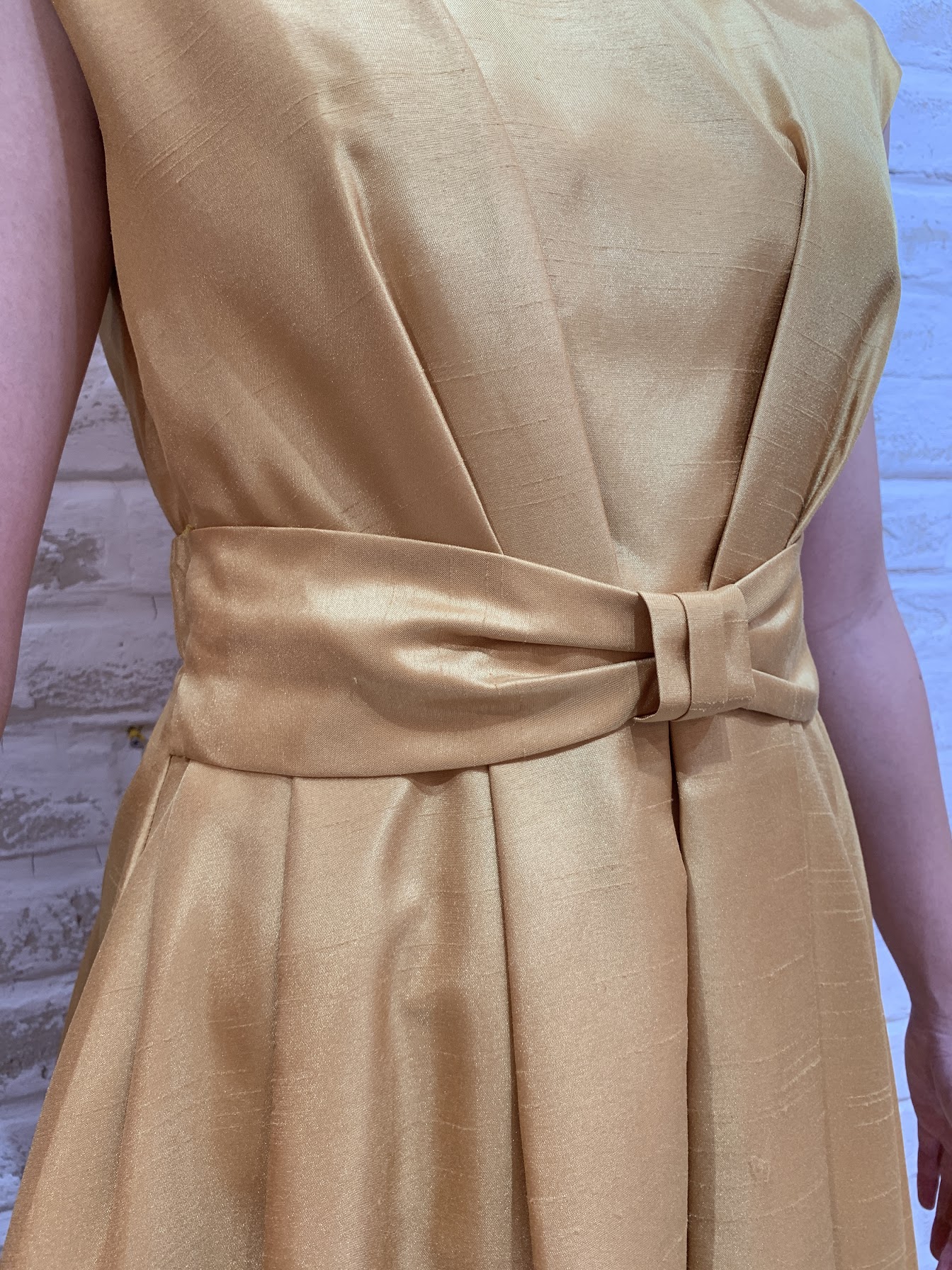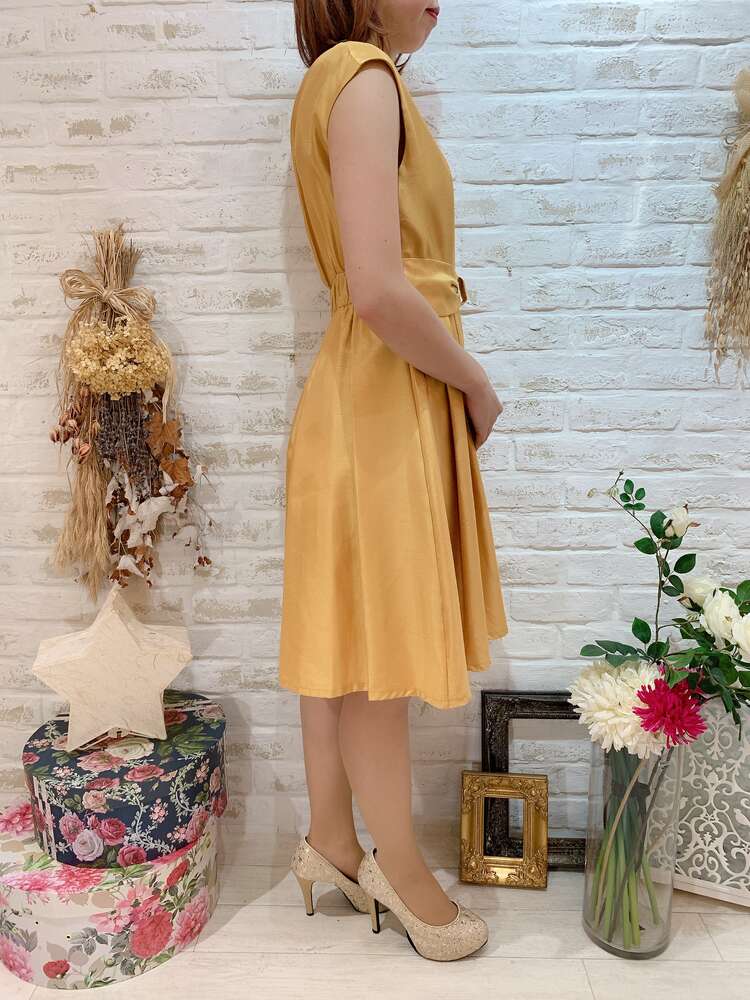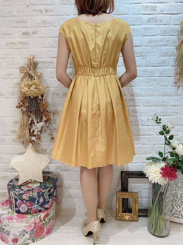 ウエストリボンフレンチスリーブ無地ドレス(イエロー)