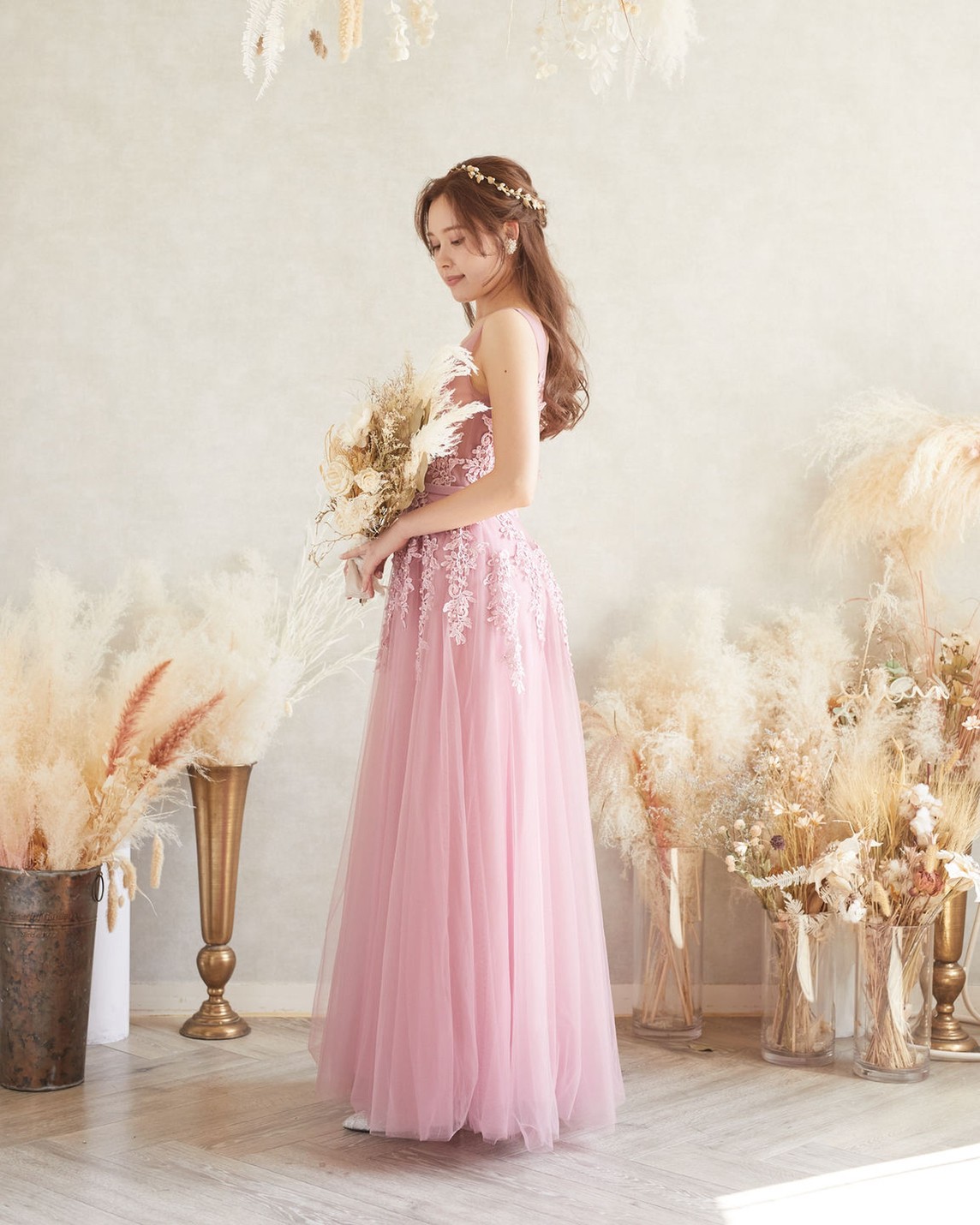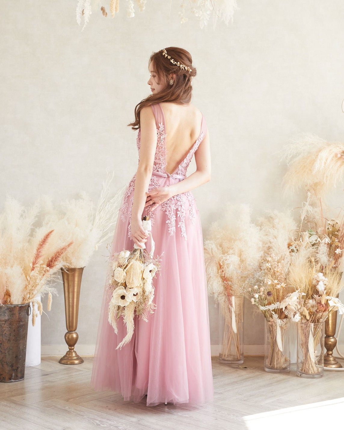 バックオープンチュールスカートロングドレス(スモーキーピンク)