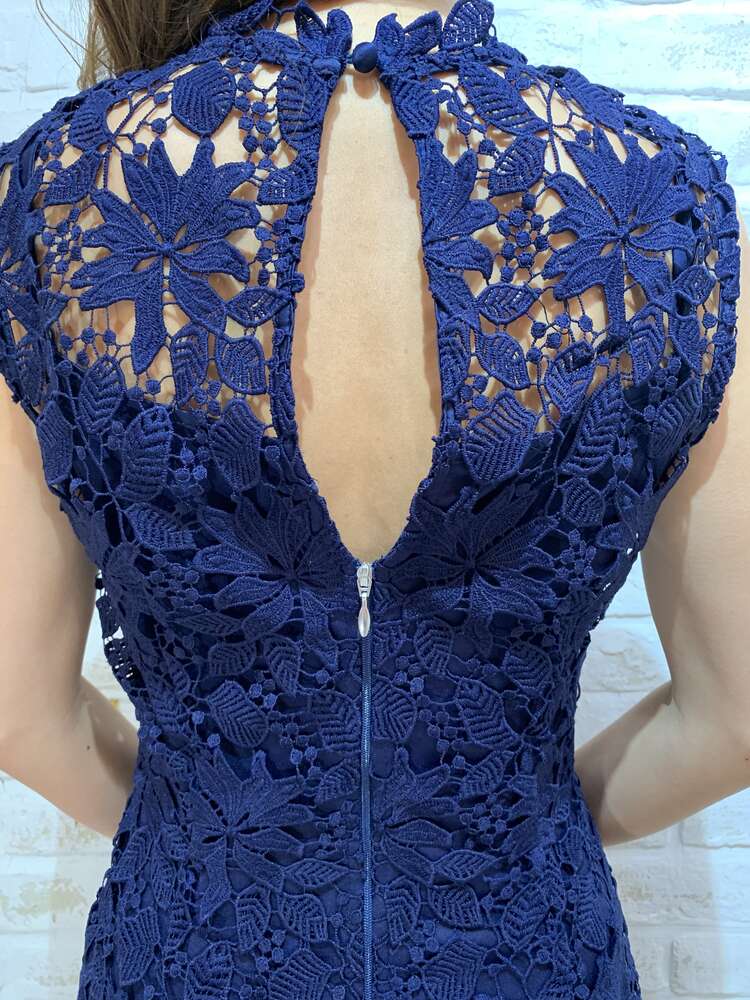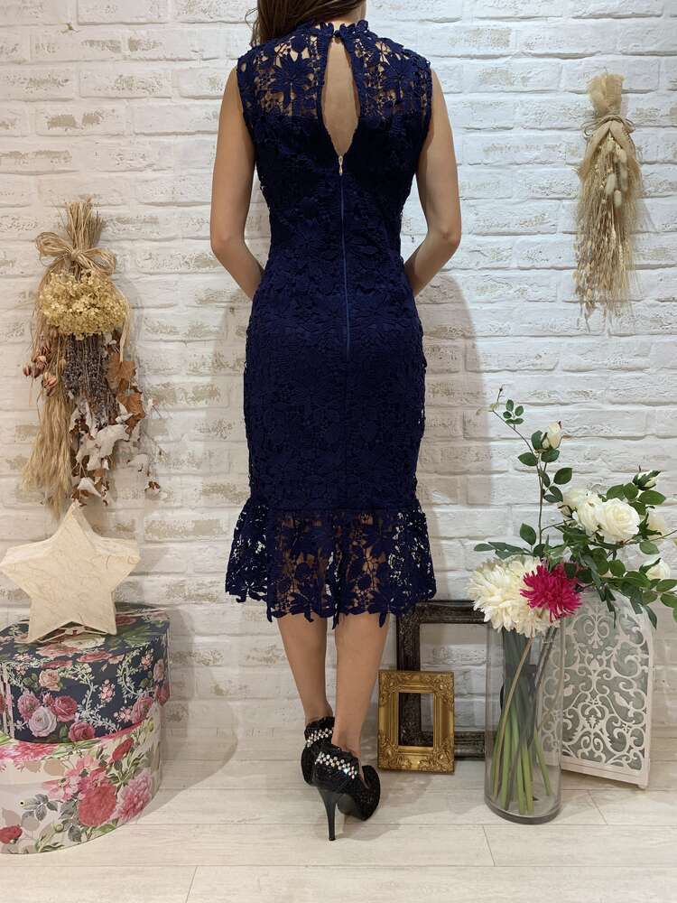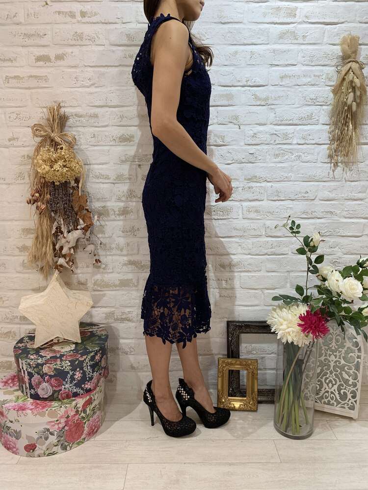 ラインがきれいなネイビーレースドレスです。大人の女性にこそ着用して頂きたい1着。マーメイドラインが女性らしく上品な雰囲気を演出してくれます。膝下で長めの丈ですがレース素材なので全体が重たく見えずにほどよく抜け感が有り。キャミソールタイプの裏地付き。肩のストラップは調節可能です。やや深めのハートカットになります。首後ろはボタンで留めるタイプになります。お食事会、謝恩会、女子会など各種パーティーにおすすめのドレス。結婚式参列やお呼ばれシーンではボレロやストールを1枚羽織ると露出感もおさえられて◎です。