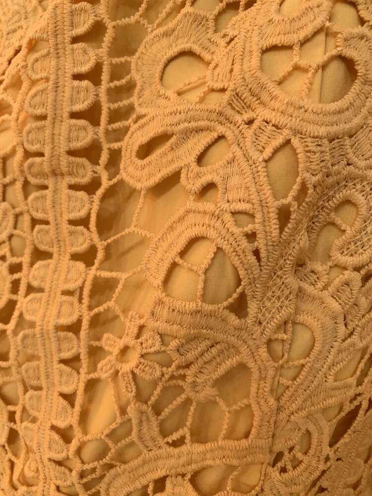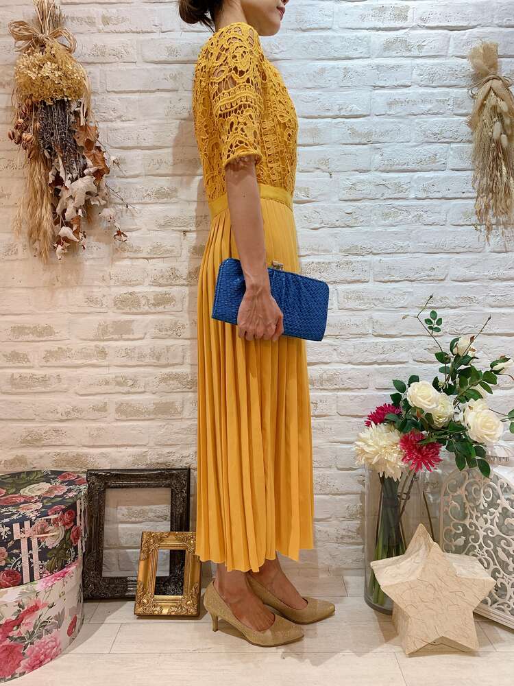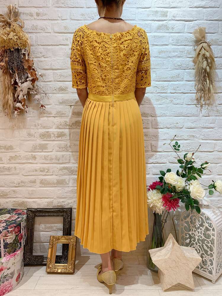マスタードイエローレーストッププリーツミモレスカートドレス