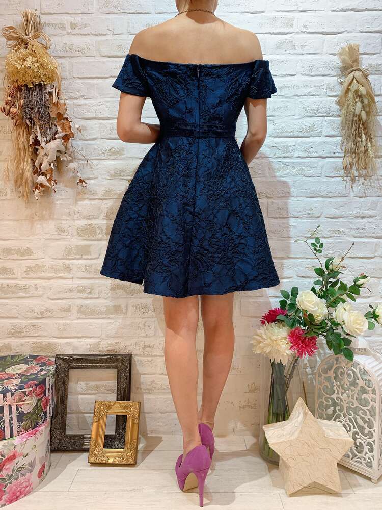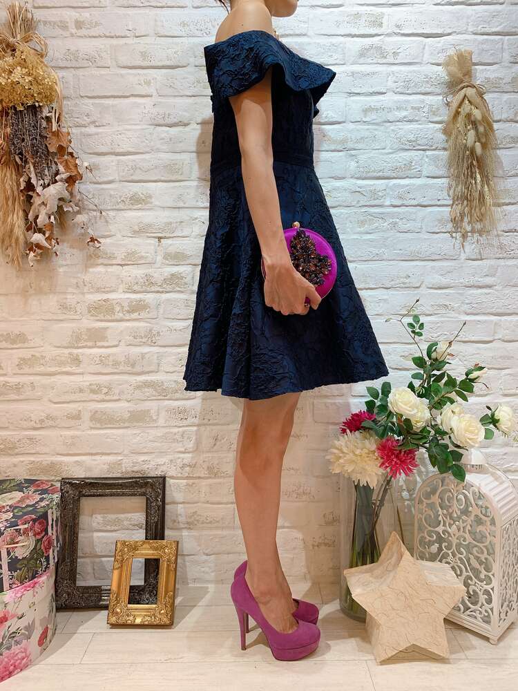 ネイビーレースオフショダーミニドレス