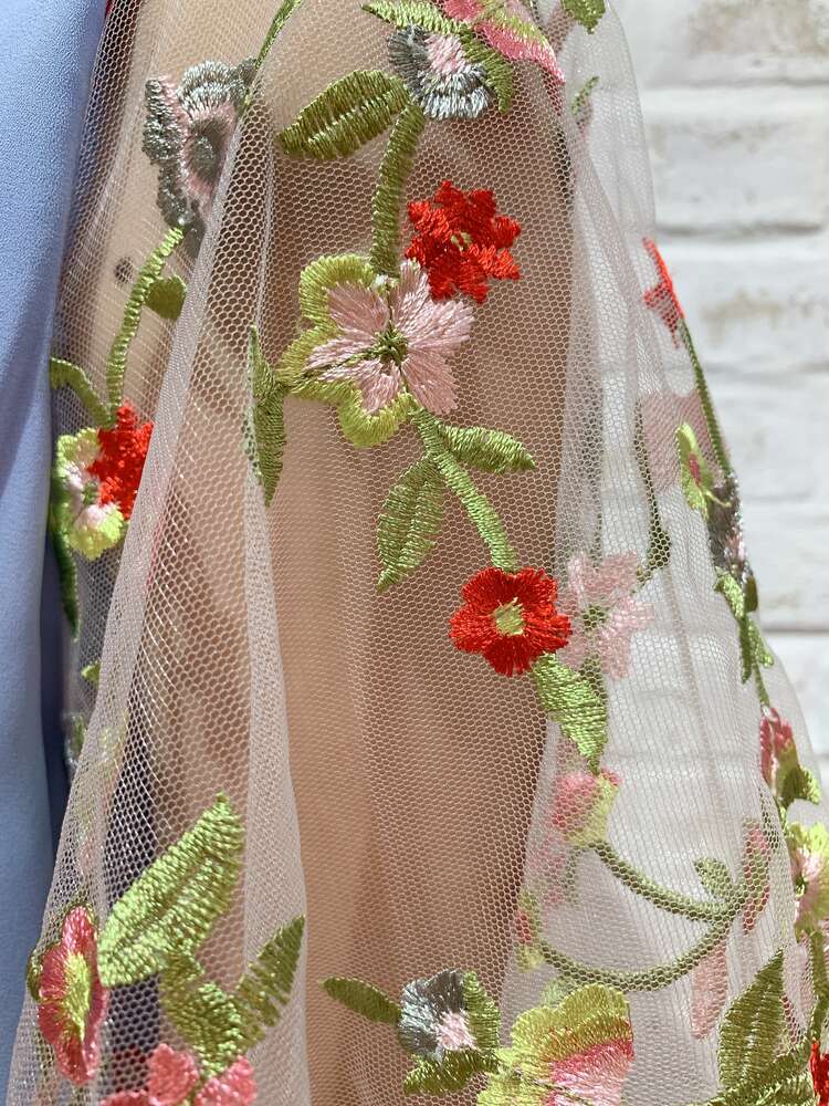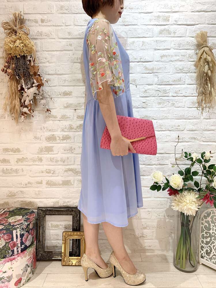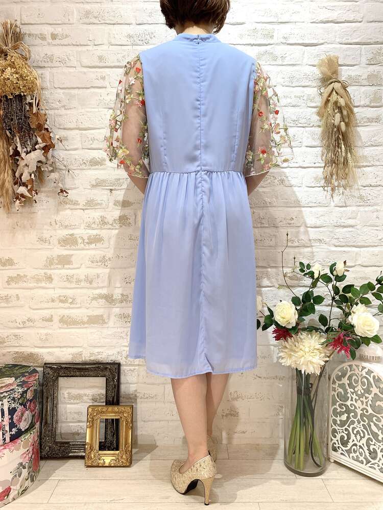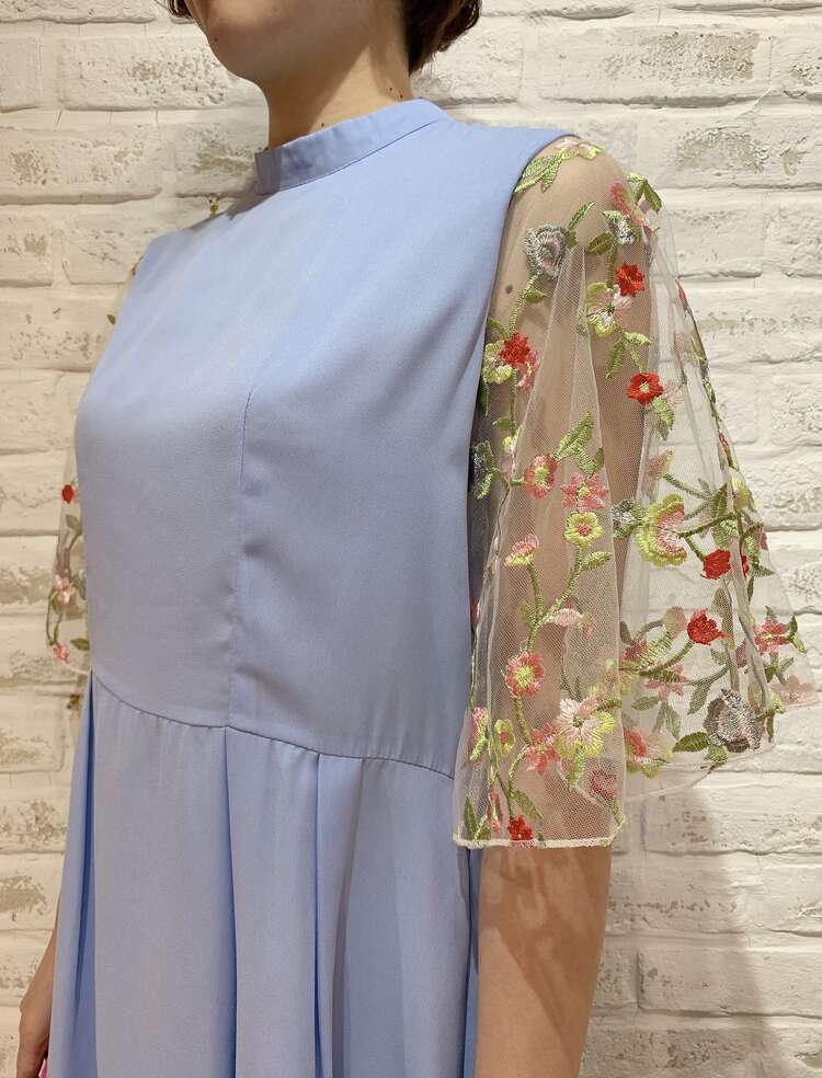 袖カラフル花柄シースルーハイネックドレス(ブルー)