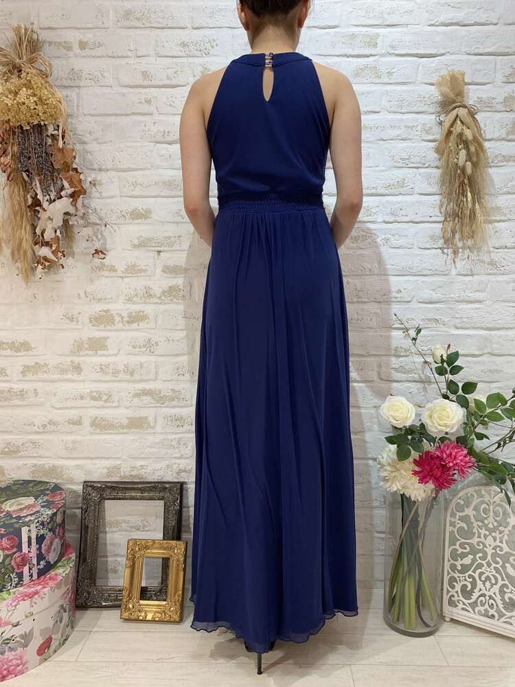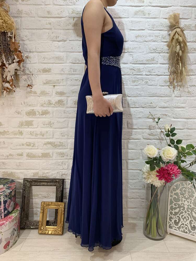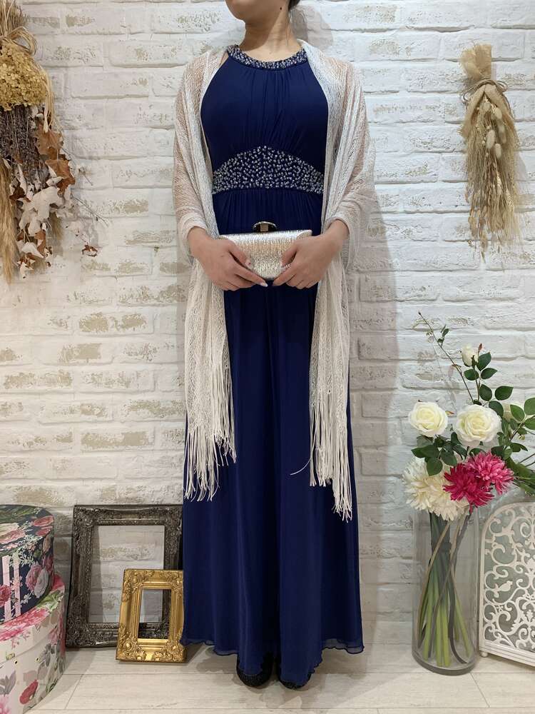 首・ウエストビジューアメリカンスリーブロングドレス(ネイビー)