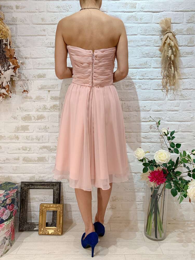 シフォン素材がやわらかい印象のベビーピンクカラードレスです。上品で女性らしいイメージのシフォン素材のベアドレスは、サイズ違いで4着ございますのでブライズメイドにもおすすめ。丈も短すぎないので身長が高めの方にも着用して頂けます。(記載している実寸サイズを必ずご確認ください。着用スタッフ身長164センチ)お食事会、謝恩会、女子会、各種パーティーなどにおすすめの1着です。結婚式参列などお呼ばれシーンにはボレロやストールなど羽織ると露出もおさえられて◎です。