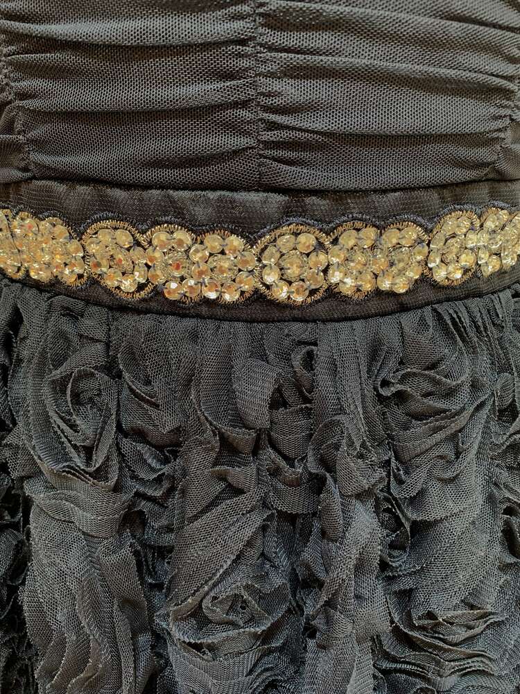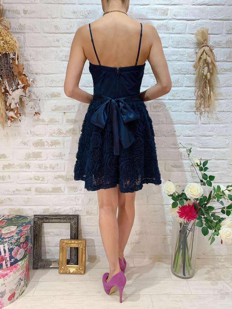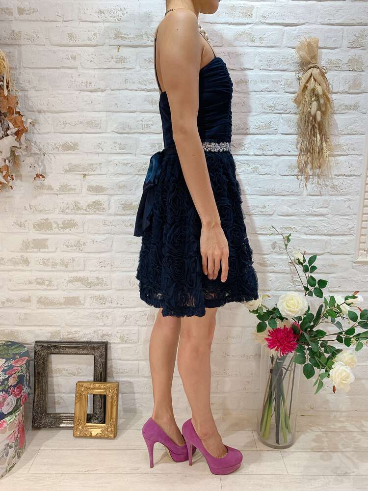 ウエストビジュー花びらスカートストラップ付ネイビードレス