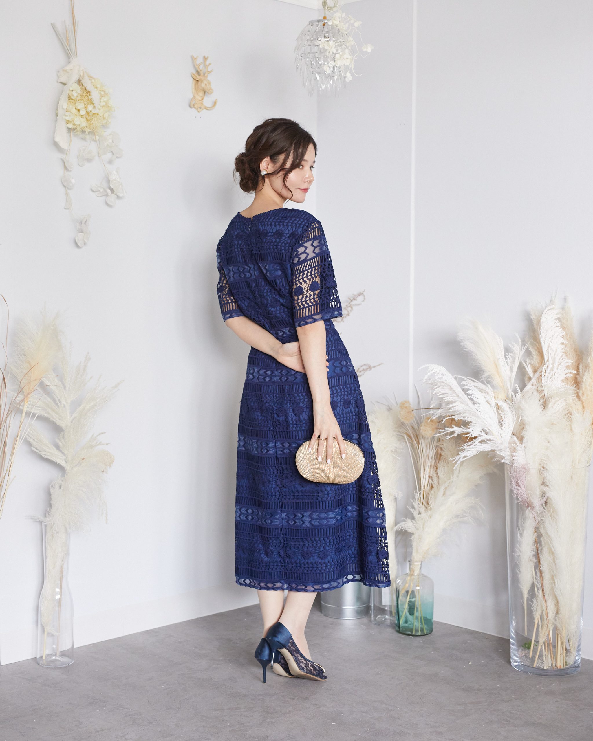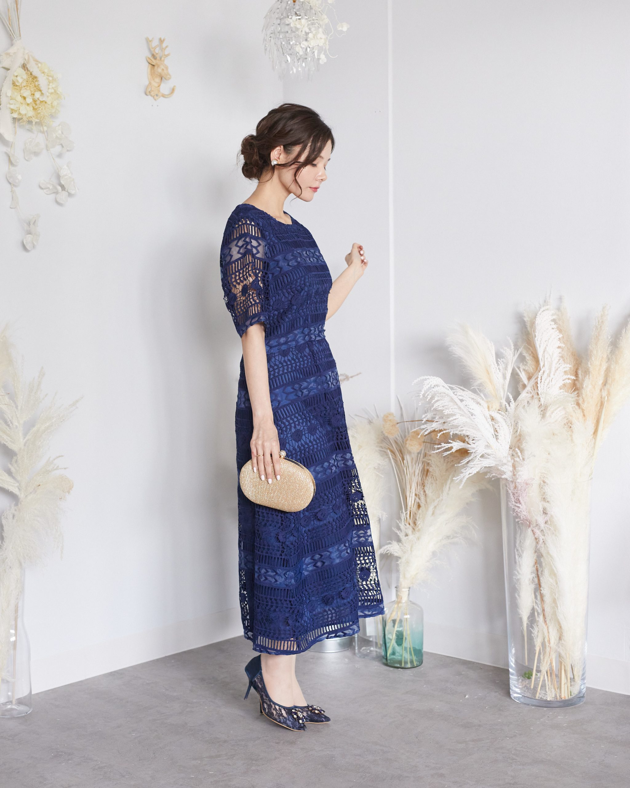 レースの切り替えがおしゃれなブルーネイビーレースドレスです。ブルーとネイビーに中間くらいのカラーで暗くなりすぎず、またレースで抜け感もでるので重たくなりすぎない商品です。繊細なレースが魅力的な1着。結婚式参列や謝恩会、女子会、お食事会、デートにおすすめの1着です。5分袖で結婚式参列やお呼ばれシーンでも羽織り物無しで着用できます。着丈も安心の長め丈なので身長が高い方にも着用して頂けます。生地は標準的な厚さで季節問わず1年中着用して頂けます。