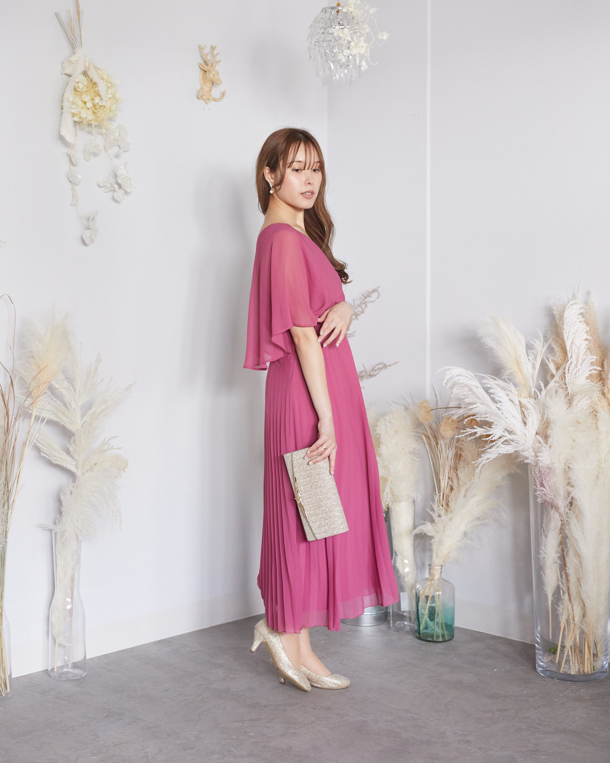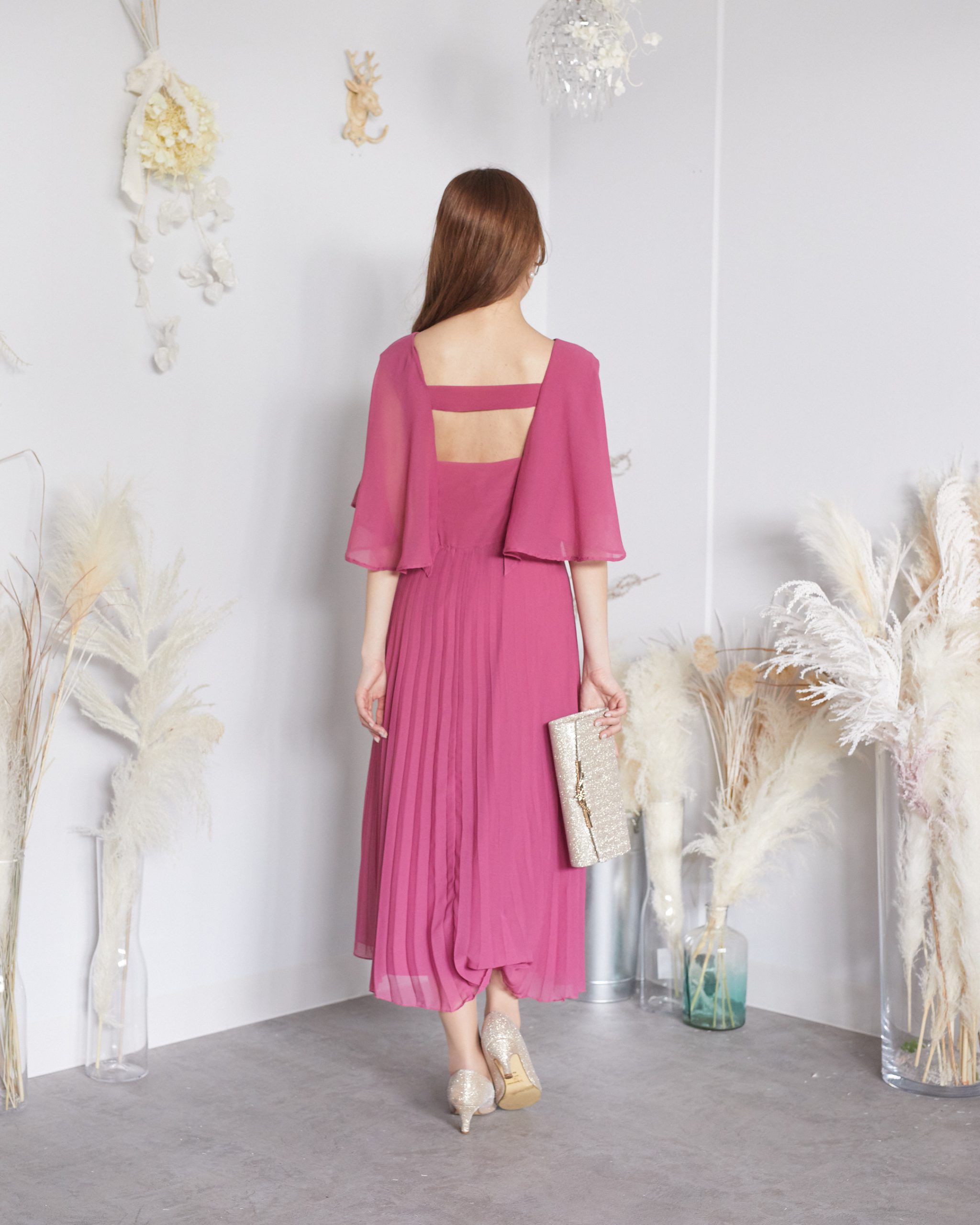 ローズカラーが魅力的な袖有りドレスです。結婚式参列や謝恩会、女子会、お食事会、デートにおすすめの1着です。デザイン性のあるバックスタイル。露出が気になる方はチューブトップなどインナーを着用して頂いても◎です。バスト部分はカシュクール風にV字になっていてお顔周りをすっきりと見せてくれます。袖も長めでしっかりと二の腕を隠してくれるので結婚式参列やお呼ばれシーンにも羽織り物無しで着用頂けます。とてもやわらかで軽やかなシフォン素材です。スカート丈も安心の長めの作りです。