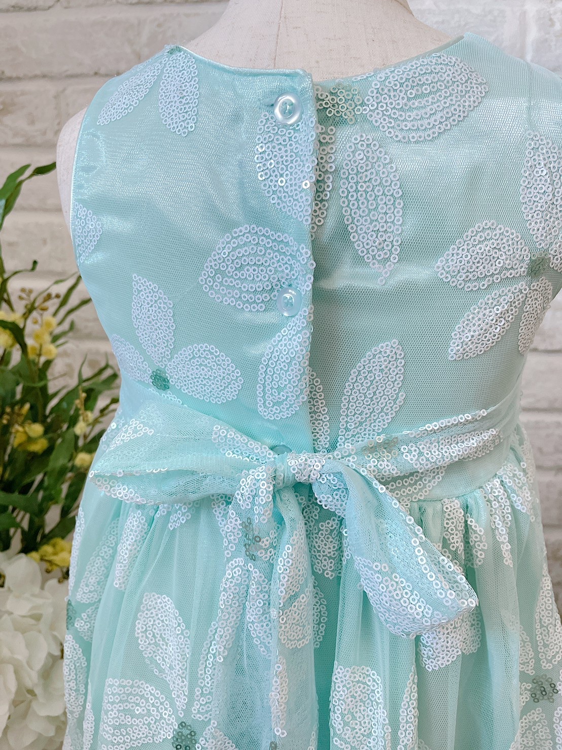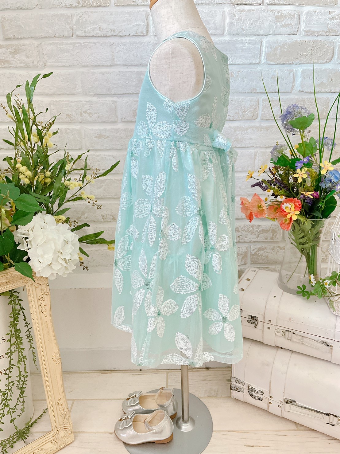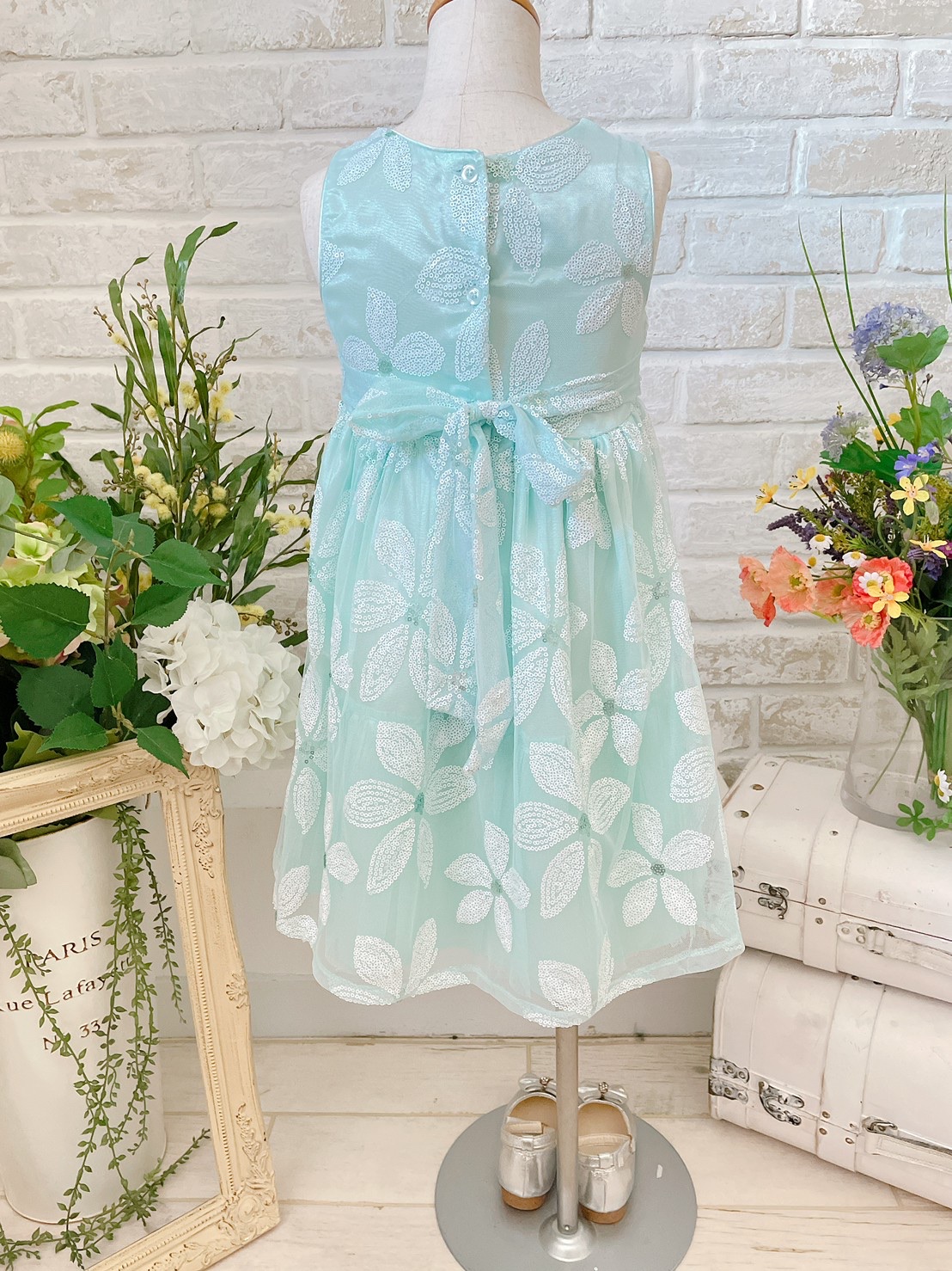 水色のベースに白いお花模様の春夏にぴったりなさわやかなドレスです。結婚式のおよばれ、フラワーガール、リングガール、発表会、演奏会、七五三にもおすすめです。 またゴージャスすぎないデザインですのでお食事の席などカジュアルな場面にも着用して頂けると思います。※画像は別商品のキッズ用パニエを着用して撮影しております。