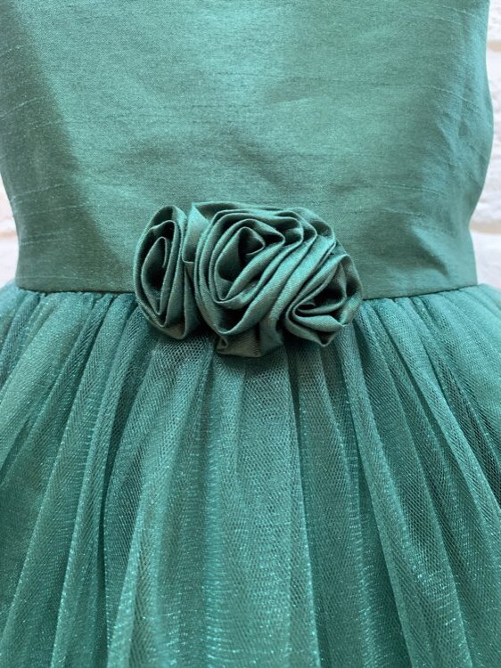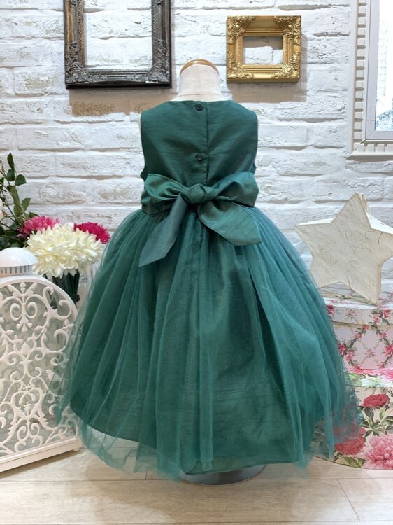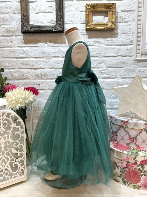 シックな深いグリーンカラーのキッズドレスです。甘すぎないカラーは少しお姉さんらしく見える1着。スカートはオーバーチュールになっておりふんわりとした形になっております。結婚式のおよばれ、フラワーガール、リングガール、発表会、演奏会、七五三にもおすすめです。※画像は別商品のキッズ用パニエを着用して撮影しております。