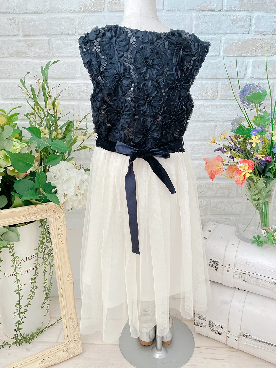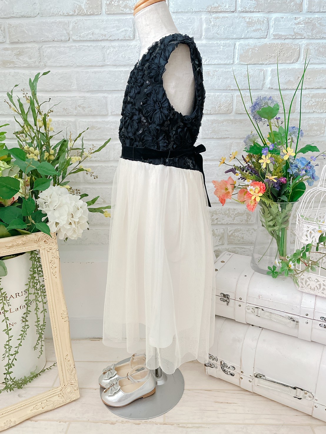 モノトーンカラーのシックなイメージのキッズドレス。上半身はスパンコール、スカート部分はチュール素材になります。ウエストにベロア素材のリボン付き。結婚式のおよばれ、フラワーガール、リングガール、発表会、演奏会、七五三にもおすすめです。※画像は別商品のキッズ用パニエを着用して撮影しております。