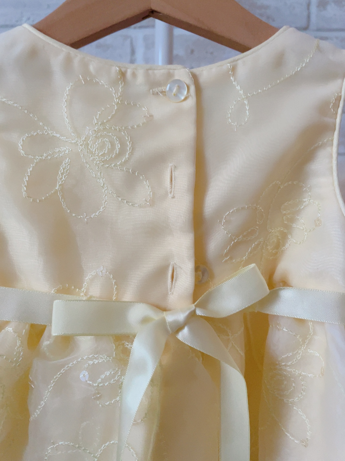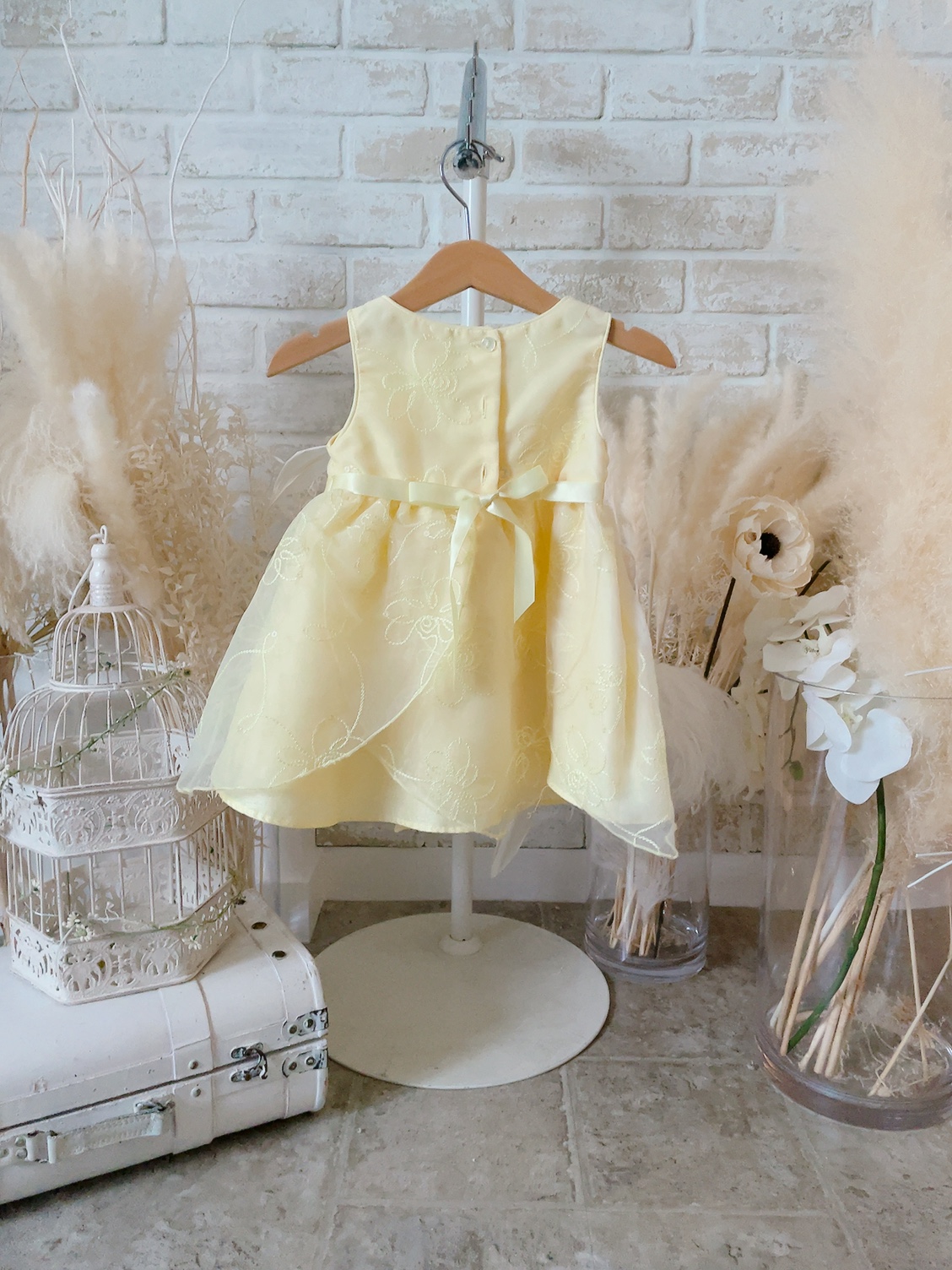 イエローカラーがキュートなベビーキッズドレス。ややハリ感のある素材はパニエを着用しなくてもふんわりとした形をたもってくれます。ウエストに小さなお花のポイント付き。後ろでウエストリボンを結ぶデザイン、ボタンで着脱するタイプになります。スカートは生地が数枚重なったデザインになっておりフェアリー感を演出してくれます♪