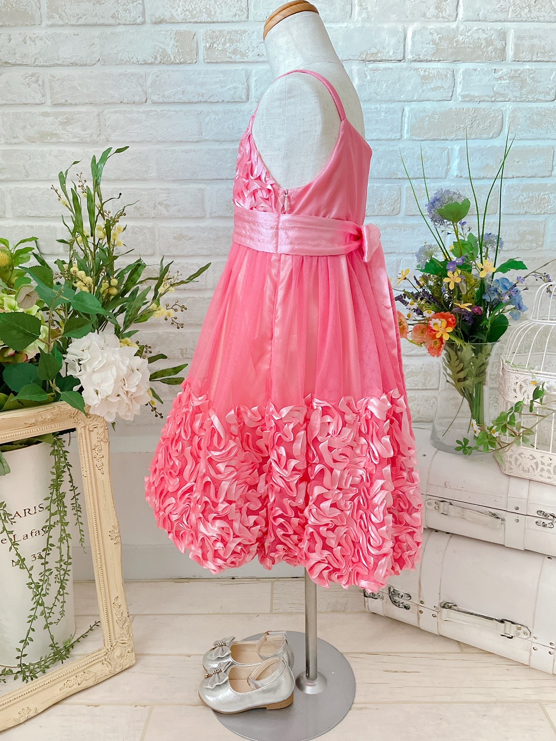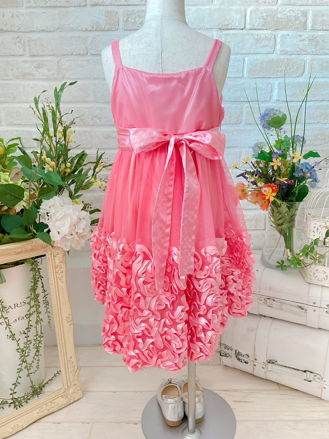 上半身とスカートすそ部分の花びらが華やかに見せてくれるキッズキャミソールドレス。ウエストリボンはやや光沢のある素材になっており上品なイメージにも。結婚式のおよばれ、フラワーガール、リングガール、発表会、演奏会、七五三にもおすすめです。※画像は別商品のキッズ用パニエを着用して撮影しております。