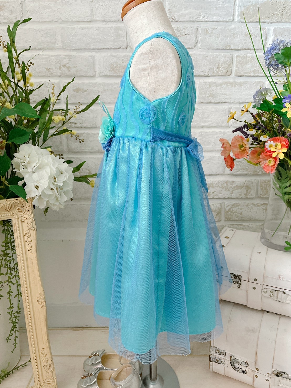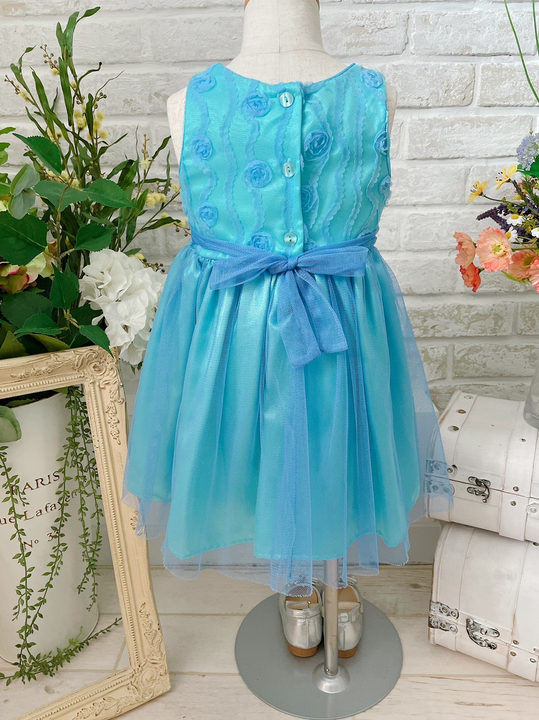 きれいなブルーカラーのキッズドレス。ウエストにはお花のポイント付きです。スカートはオーバーチュールになっており、ふんわりかわいらしいイメージです。上半身にはところどころにバラが施されています。結婚式のおよばれ、フラワーガール、リングガール、発表会、演奏会、七五三にもおすすめです。※画像は別商品のキッズ用パニエを着用して撮影しております。