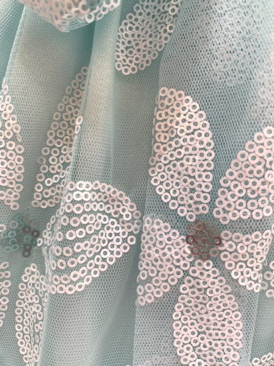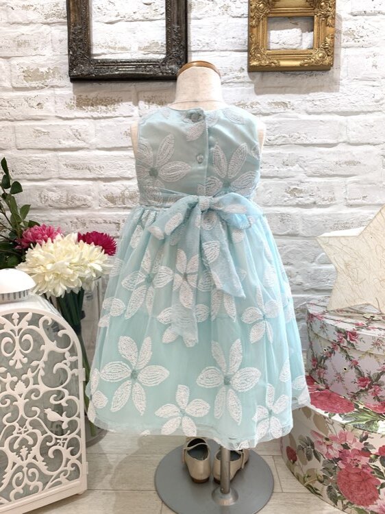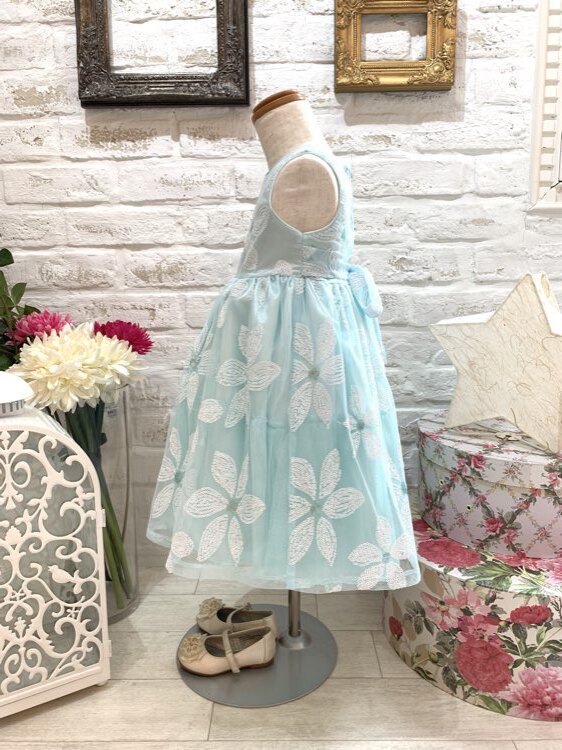 水色のベースに白いお花模様の春夏にぴったりなさわやかなドレスです。結婚式のおよばれ、フラワーガール、リングガール、発表会、演奏会、七五三にもおすすめです。 またゴージャスすぎないデザインですのでお食事の席などカジュアルな場面にも着用して頂けると思います。※画像は別商品のキッズ用パニエを着用して撮影しております。